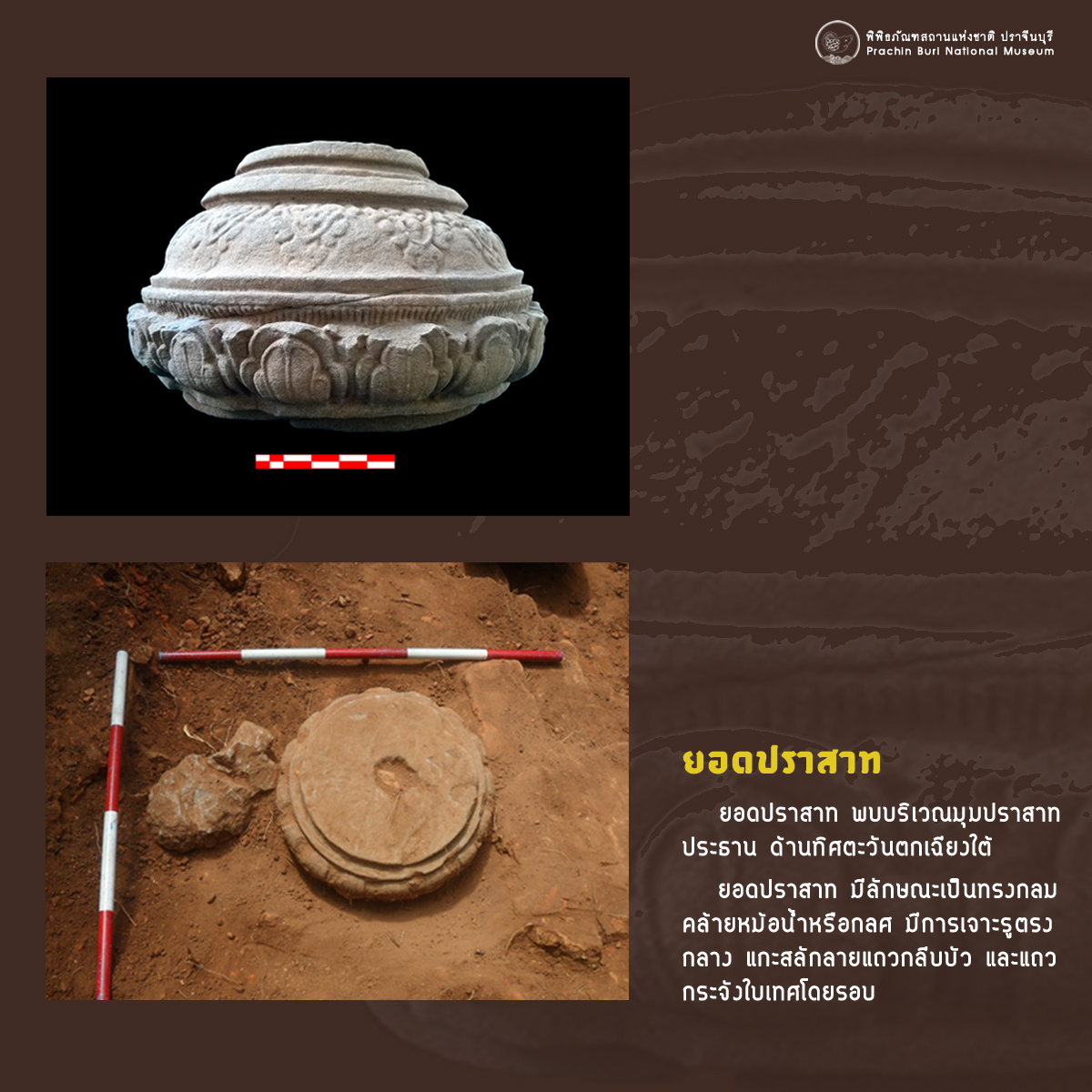 - ยอดปราสาท พบบริเวณมุมปราสาทประธาน ด้านทิศตะวันตกเฉียงใต้ มีลักษณะเป็นทรงกลม คล้ายหม้อน้ำหรือกลศ มีการเจาะรูตรงกลาง แกะสลักลายแถวกลีบบัว และแถวกระจังใบเทศโดยรอบ