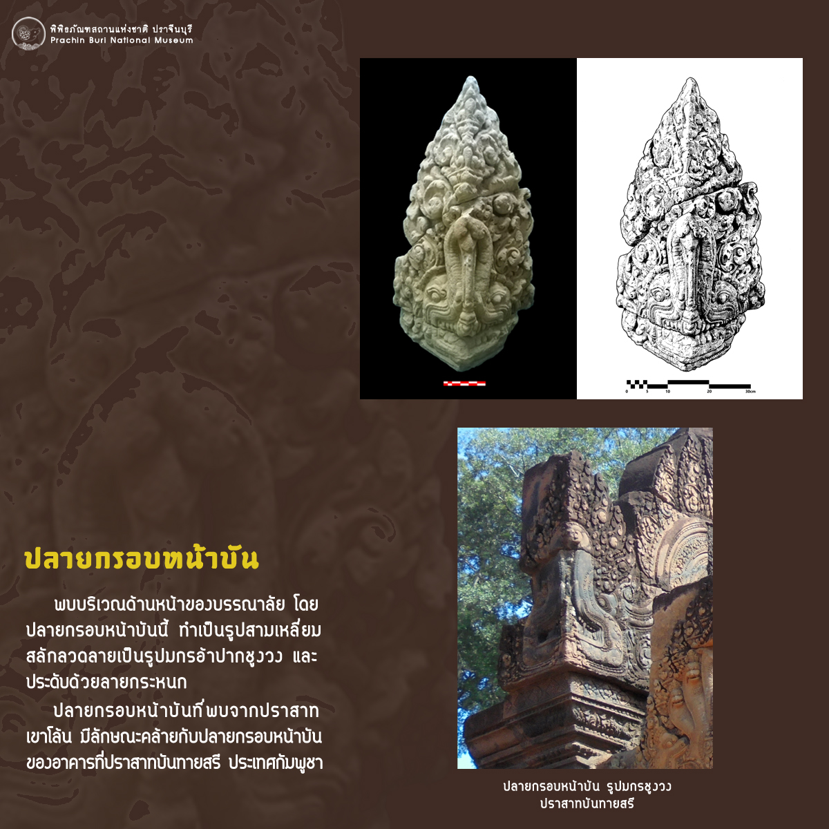 - ปลายกรอบหน้าบัน พบบริเวณด้านหน้าของบรรณาลัย ทำเป็นรูปสามเหลี่ยมสลักลวดลายเป็นรูปมกรอ้าปากชูงวง และประดับด้วยลายกระหนก ปลายกรอบหน้าบันที่พบจากปราสาทเขาโล้น มีลักษณะคล้ายกับปลายกรอบหน้าบันของอาคารที่ปราสาทบันทายสรี ประเทศกัมพูชา