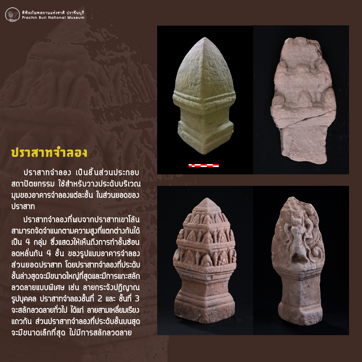 - ปราสาทจำลอง เป็นชิ้นส่วนประกอบสถาปัตยกรรม ใช้สำหรับวางประดับบริเวณมุมของอาคารจำลองแต่ละชั้น ในส่วนยอดของปราสาท ปราสาทจำลองที่พบจากปราสาทเขาโล้น สามารถจัดจำแนกตามความสูงที่แตกต่างกันได้เป็น 4 กลุ่ม ซึ่งแสดงให้เห็นถึงการทำชั้นซ้อนลดหลั่นกัน 4 ชั้น ของรูปแบบอาคารจำลองส่วนยอดปราสาท โดยปราสาทจำลองที่ประดับชั้นล่างสุดจะมีขนาดใหญ่ที่สุดและมีการแกะสลักลวดลายแบบพิเศษ เช่น ลายกระจังปฏิญาณ รูปบุคคล ปราสาทจำลองชั้นที่ 2 และ ชั้นที่ 3 จะสลักลวดลายทั่วไป ได้แก่ ลายสามเหลี่ยมเรียงแถวกัน ส่วนปราสาทจำลองที่ประดับชั้นบนสุด จะมีขนาดเล็กที่สุด ไม่มีการสลักลวดลาย