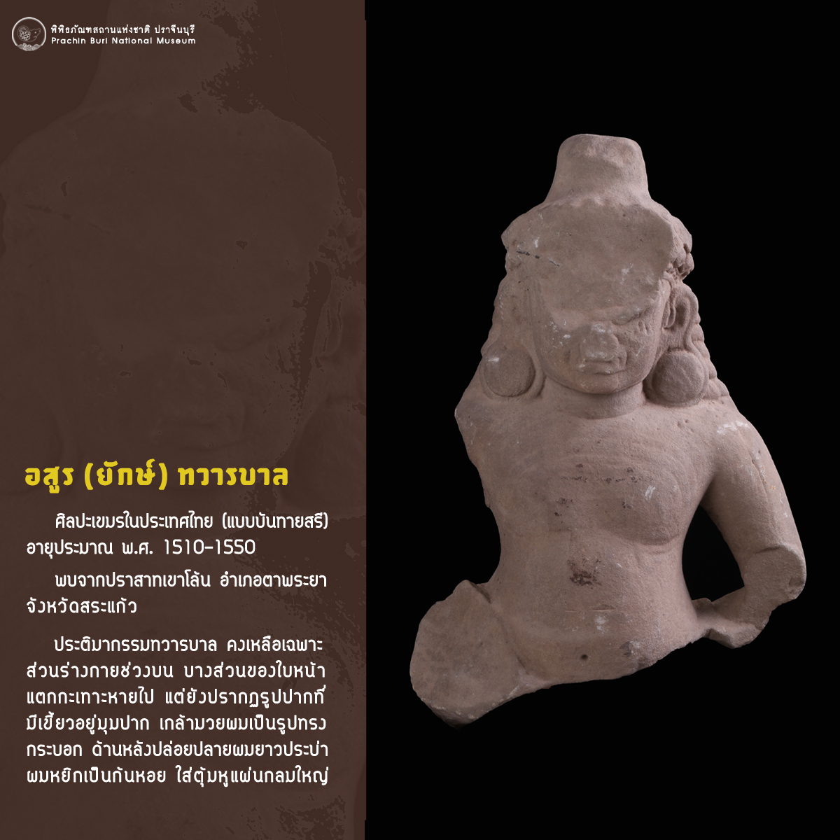 - อสูร (ยักษ์) ทวารบาล ศิลปะเขมรในประเทศไทย (แบบบันทายสรี) อายุประมาณ พ.ศ. 1510-1550 เป็นประติมากรรมทวารบาล คงเหลือเฉพาะส่วนร่างกายช่วงบน บางส่วนของใบหน้าแตกกะเทาะหายไป แต่ยังปรากฏรูปปากที่มีเขี้ยวอยู่มุมปาก เกล้ามวยผมเป็นรูปทรงกระบอก ด้านหลังปล่อยปลายผมยาวประบ่าผมหยิกเป็นก้นหอย ใส่ตุ้มหูแผ่นกลมใหญ่