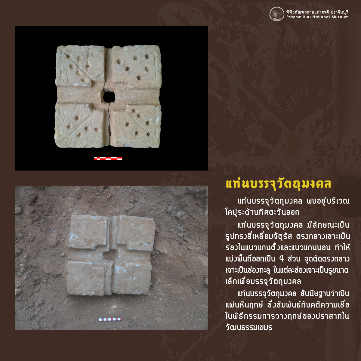 - แท่นบรรจุวัตถุมงคล พบอยู่บริเวณโคปุระด้านทิศตะวันออก มีลักษณะเป็นรูปทรงสี่เหลี่ยมจัตุรัส ตรงกลางเซาะเป็นร่องในแนวแกนตั้งและแนวแกนนอน ทำให้แบ่งพื้นที่ออกเป็น 4 ส่วน จุดตัดตรงกลางเจาะเป็นช่องทะลุ ในแต่ละช่องเจาะเป็นรูขนาดเล็กเพื่อบรรจุวัตถุมงคล สันนิษฐานว่าเป็นแผ่นหินฤกษ์ ซึ่งสัมพันธ์กับคติความเชื่อในพิธีกรรมการวางฤกษ์ของปราสาทในวัฒนธรรมเขมร