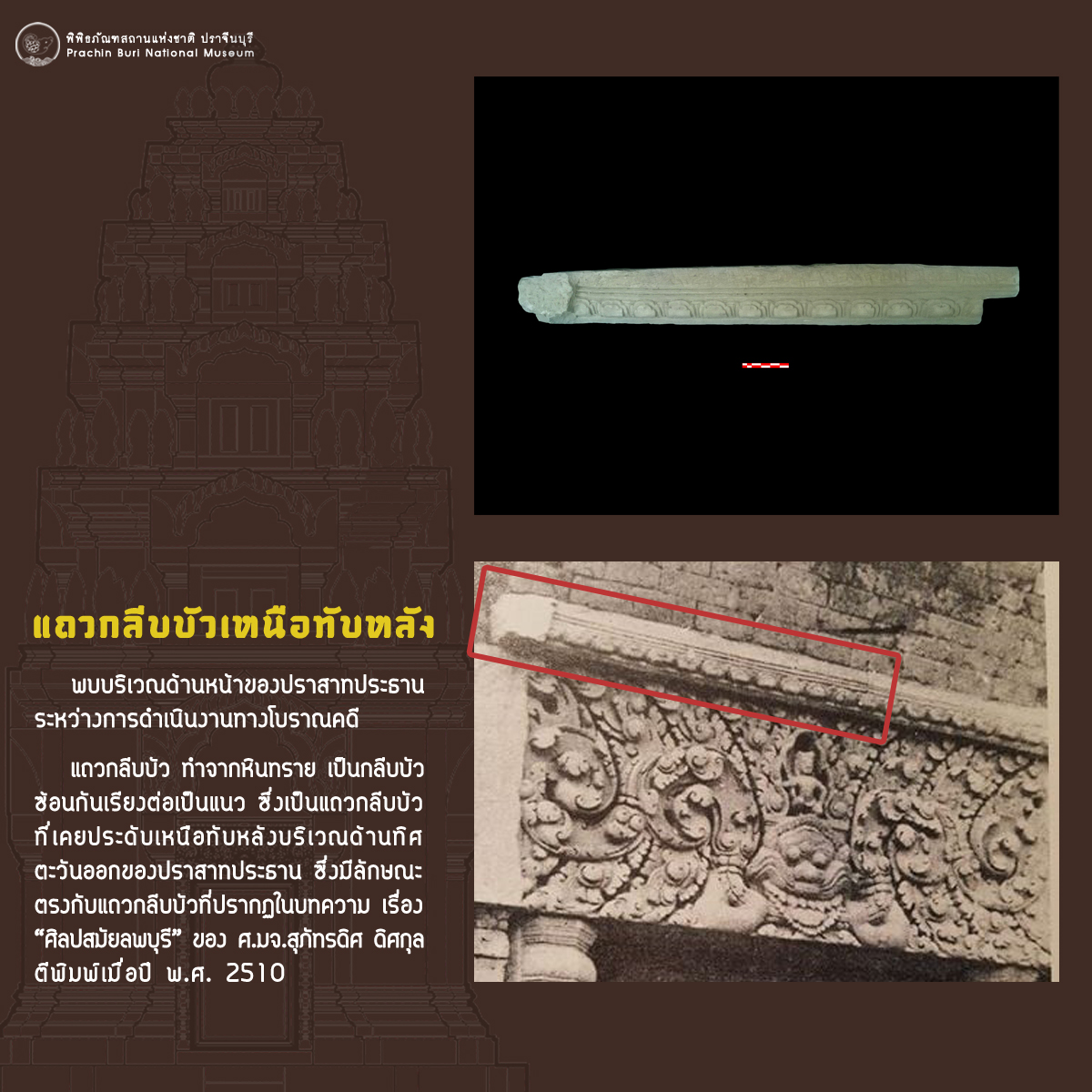 - แถวกลีบบัวเหนือทับหลัง พบบริเวณด้านหน้าของปราสาทประธาน ระหว่างการดำเนินงานทางโบราณคดี เป็นแถวกลีบบัว ทำจากหินทราย ซึ่งเป็นกลีบบัวซ้อนกันเรียงต่อเป็นแนว และเป็นแถวกลีบบัวที่เคยประดับเหนือทับหลังบริเวณด้านทิศตะวันออกของปราสาทประธาน ซึ่งมีลักษณะตรงกับแถวกลีบบัวที่ปรากฏในบทความ เรื่อง “ศิลปสมัยลพบุรี” ของ ศ.มจ.สุภัทรดิศ ดิศกุล ตีพิมพ์เมื่อปี พ.ศ. 2510