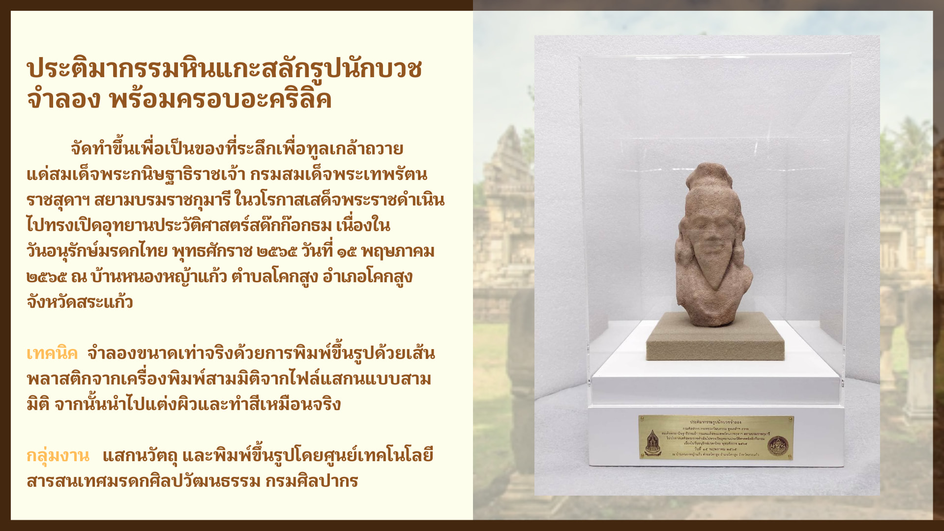 *****เนื่องในโอกาสที่สมเด็จพระกนิษฐาธิราชเจ้า กรมสมเด็จพระเทพรัตนราชสุดา ฯ สยามบรมราชกุมารี เสด็จพระราชดำเนินไปทรงเปิดอุทยานประวัติศาสตร์สด๊กก๊อกธม ในวันที่ ๑๕ พฤษภาคม ๒๕๖๕ ที่ผ่านมา ณ บ้านหนองหญ้าแก้ว ตำบลโคกสูง อำเภอโคกสูง จังหวัดสระแก้ว กรมศิลปากร ได้จัดทำประติมากรรมรูปนักบวชจำลอง เพื่อทูลเกล้า ฯ ถวายเป็นของที่ระลึก ทั้งนี้ ประติมากรรมหินแกะสลักรูปนักบวชเป็นชิ้นส่วนสถาปัตยกรรมที่พบจากปราสาทสด๊กก๊อกธม ขนาดสูง ๒๑ ซม. กว้าง ๑๐ ซม. และหนา ๙ ซม. ปัจจุบันจัดแสดงที่พิพิธภัณฑสถานแห่งชาติ ปราจีนบุรี