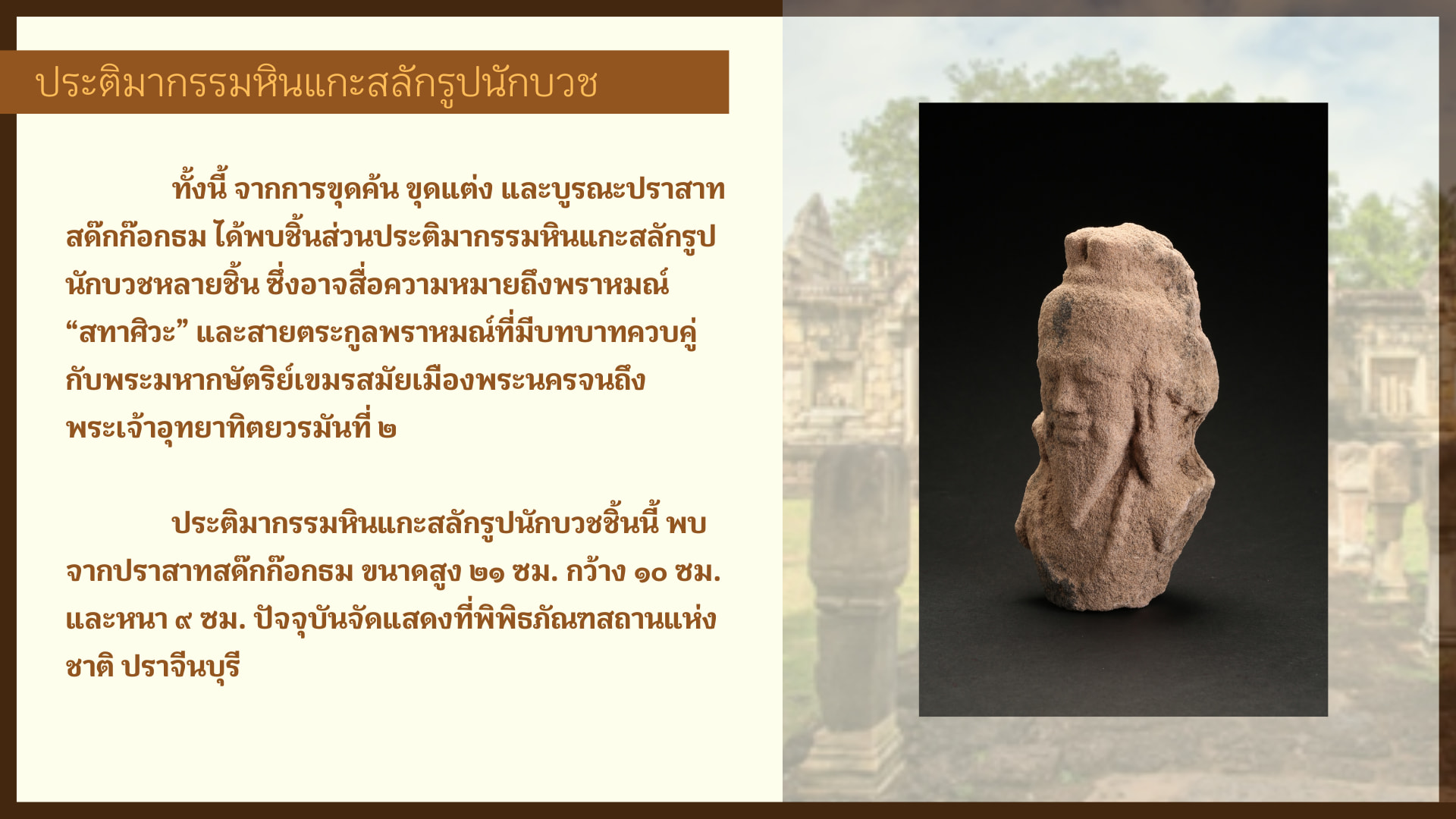 *****ทั้งนี้ จากการขุดค้น ขุดแต่ง และบูรณะปราสาทสด๊กก๊อกธม ได้พบชิ้นส่วนประติมากรรมหินแกะสลักรูปนักบวชหลายชิ้น ซึ่งอาจสื่อความหมายถึงพราหมณ์ “สทาศิวะ” และสายตระกูลพราหมณ์ที่มีบทบาทควบคู่กับพระมหากษัตริย์เขมรสมัยเมืองพระนครจนถึงพระเจ้าอุทยาทิตยวรมันที่ ๒