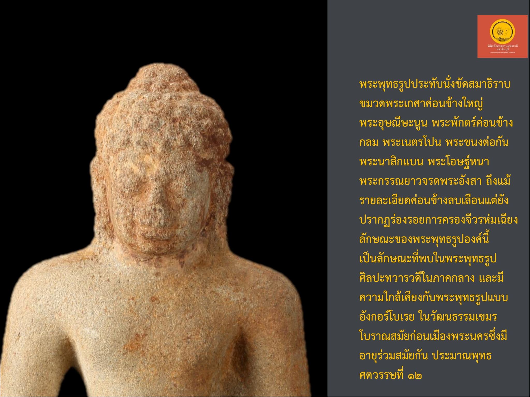 - พระพุทธรูปประทับนั่งขัดสมาธิราบ ขมวดพระเกศาค่อนข้างใหญ่ พระอุษณีษะนูน พระพักตร์ค่อนข้างกลม พระเนตรโปน พระขนงต่อกัน พระนาสิกแบน พระโอษฐ์หนา พระกรรณยาวจรดพระอังสา ถึงแม้รายละเอียดค่อนข้างลบเลือนแต่ยังปรากฏร่องรอยการครองจีวรห่มเฉียง ลักษณะของพระพุทธรูปองค์นี้เป็นลักษณะที่พบในพระพุทธรูปศิลปะทวารวดีในภาคกลาง และมีความใกล้เคียงกับพระพุทธรูปแบบอังกอร์โบเรย ในวัฒนธรรมเขมรโบราณสมัยก่อนเมืองพระนครซึ่งมีอายุร่วมสมัยกัน ประมาณพุทธศตวรรษที่ ๑๒
