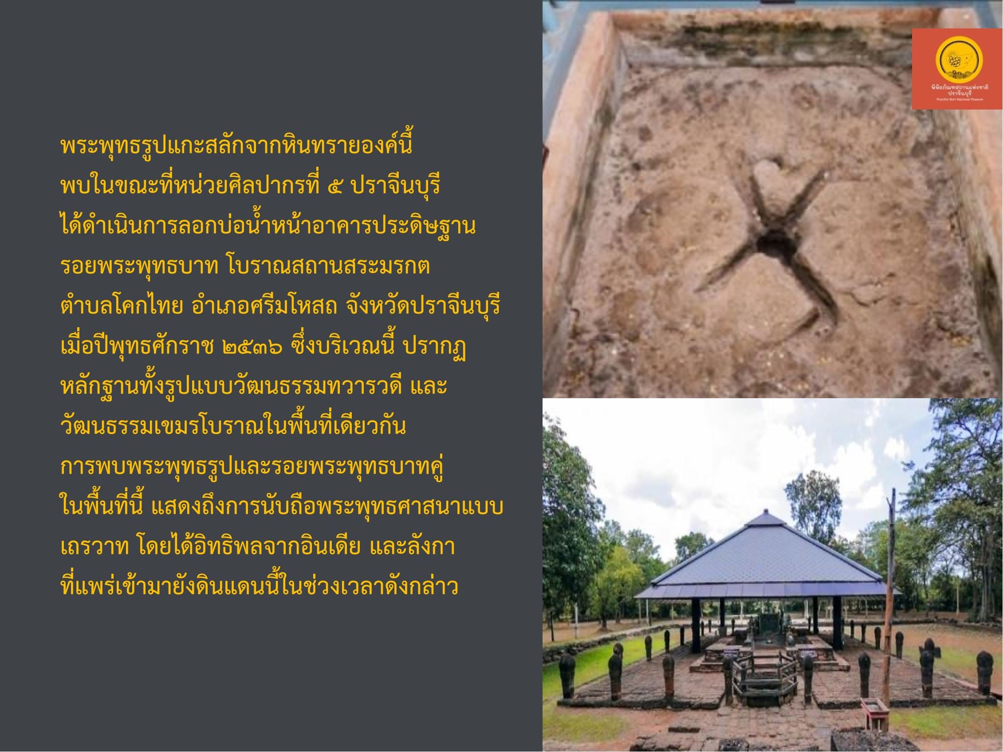 - พระพุทธรูปแกะสลักจากหินทรายองค์นี้ พบในขณะที่หน่วยศิลปากรที่ ๕ ปราจีนบุรี ได้ดำเนินการลอกบ่อน้ำหน้าอาคารประดิษฐานรอยพระพุทธบาท โบราณสถานสระมรกต ตำบลโคกไทย อำเภอศรีมโหสถ จังหวัดปราจีนบุรี เมื่อปีพุทธศักราช ๒๕๓๖ ซึ่งบริเวณนี้ ปรากฏหลักฐานทั้งรูปแบบวัฒนธรรมทวารวดี และวัฒนธรรมเขมรโบราณในพื้นที่เดียวกัน การพบพระพุทธรูปและรอยพระพุทธบาทคู่ในพื้นที่นี้ แสดงถึงการนับถือพระพุทธศาสนาแบบเถรวาท โดยได้อิทธิพลจากอินเดีย และลังกา ที่แพร่เข้ามายังดินแดนนี้ในช่วงเวลาดังกล่าว