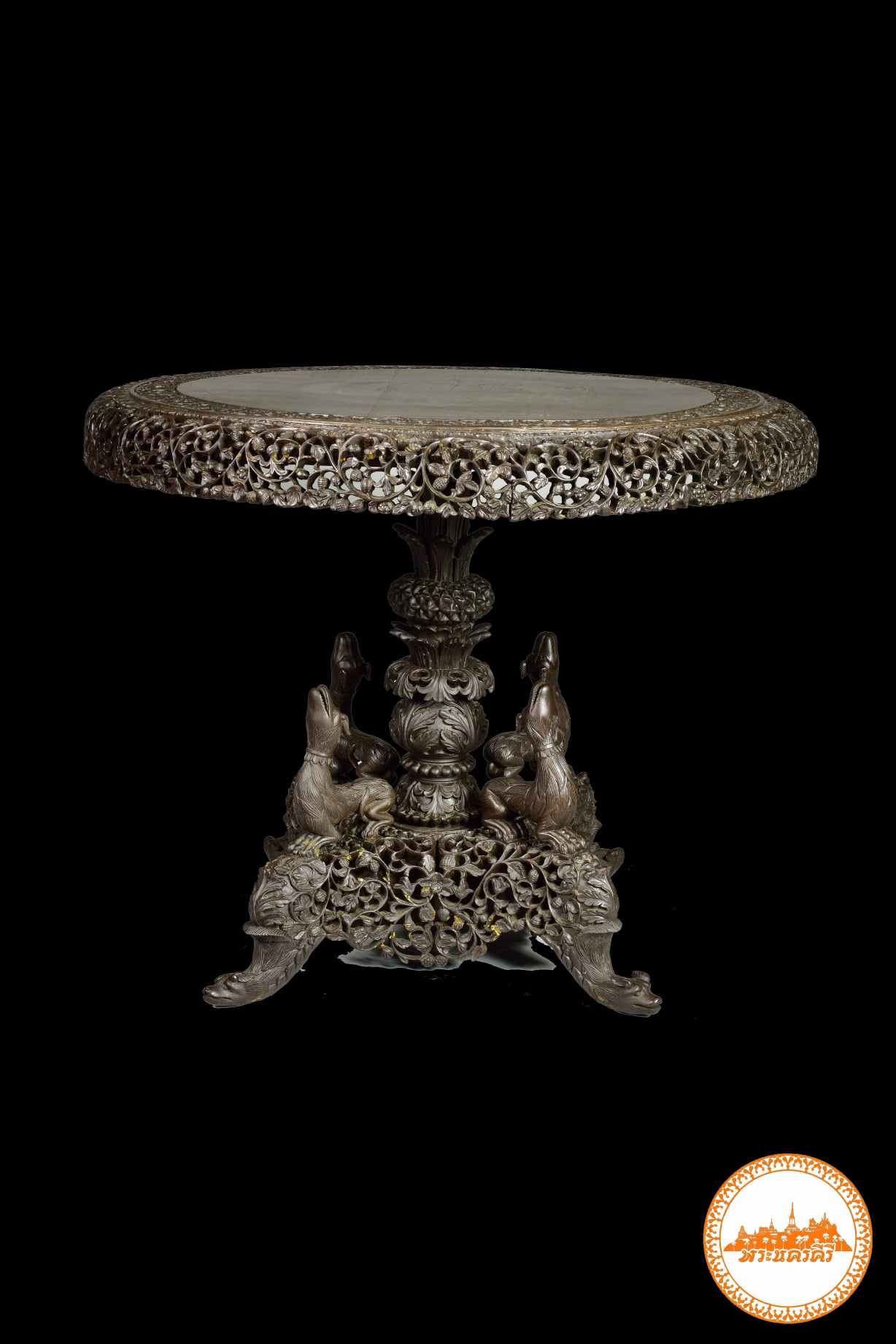 โบราณวัตถุ ศิลปวัตถุชิ้นสำคัญของพิพิธภัณฑสถานแห่งชาติ พระนครคีรีที่จะนำเสนอในครั้งนี้ ก็คือ โต๊ะกลมทาสีไม้ชิงชัน ขนาดสูง ๘๔ เซนติเมตร กว้าง ๑๐๖ เซนติเมตร มีขาเดียวรองรับด้วยฐาน ๔ ขา จำหลักลายพันธุ์ไม้เป็นรูปลายก้านขดและพรรณพฤกษา ด้านบนขาทั้ง ๔ มีการสลักไม้เป็นรูปสุนัข ๔ ตัวเงยหน้าขึ้นซึ่งเป็นลักษณะที่โดดเด่นของโบราณวัตถุชิ้นนี้ เป็นของที่เก็บรักษาอยู่ที่พระที่นั่งเพชรภูมิไพโรจน์มาแต่เดิม ปัจจุบันจัดแสดงอยู่ที่ห้องทรงพระสำราญ พระที่นั่งปราโมทย์มไหสวรรย์ (บน)