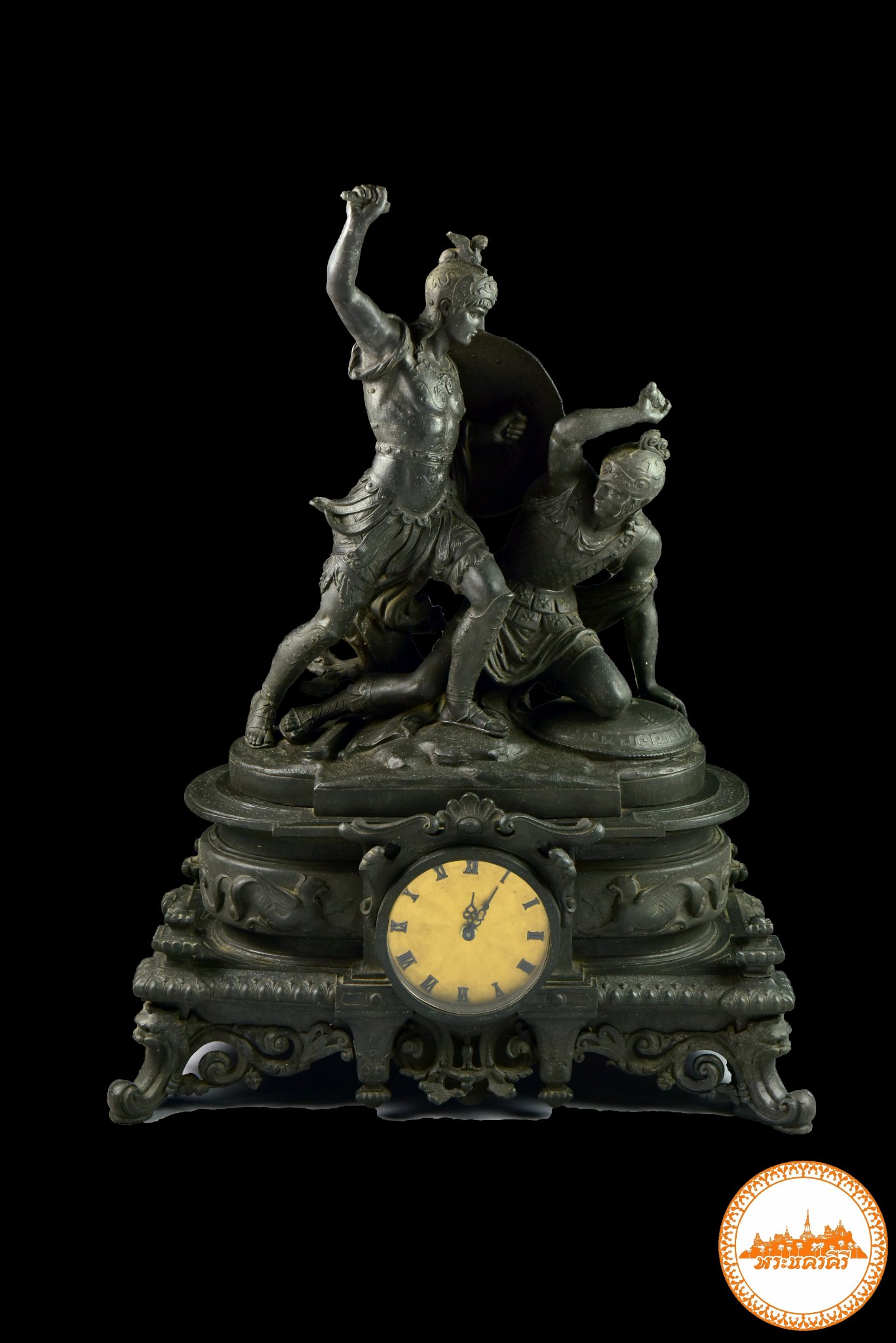 โบราณวัตถุ ศิลปวัตถุชิ้นสำคัญของพิพิธภัณฑสถานแห่งชาติ พระนครคีรีที่จะนำเสนอในครั้งนี้ ก็คือ นาฬิกาตั้งโต๊ะรูปตุ๊กตานักรบที่แต่งกายแบบกรีกโรมัน ๒ คนกำลังต่อสู้กัน นักรบที่ยืนมีลักษณะพิเศษ ก็คือ การสวมหมวกที่มีการประดับสัตว์ในเทพนิยายสฟิงซ์ลักษณะมีใบหน้าและทรวงอกของหญิงสาว ท่อนล่างเป็นสิงโตและมีปีกแบบนกอินทรีอยู่บนหมวก นักรบทั้งสองอยู่บนฐานรูปไข่รองรับด้วยฐานเหลี่ยม ชำรุดตรงกลางฐานมีช่องกลมทะลุทั้งสองด้าน ดาบนักรบทั้ง ๒ หักหายไป ขาที่รองรับมุมชำรุดหักหายทั้ง ๒ ข้าง ซ่อมใหม่โดยนำโครงไม้มาเสริมทั้งสองข้าง ชายผ้าด้านหลังนักรบที่ยืนหักหาย ลายใบไม้ที่ตกแต่งฐานล่างหักหาย เป็นของที่เก็บรักษาอยู่ที่พระที่นั่งเพชรภูมิไพโรจน์มาแต่เดิม ปัจจุบันจัดแสดงอยู่ที่ห้องพระสุธารสชา พระที่นั่งเพชรภูมิไพโรจน์