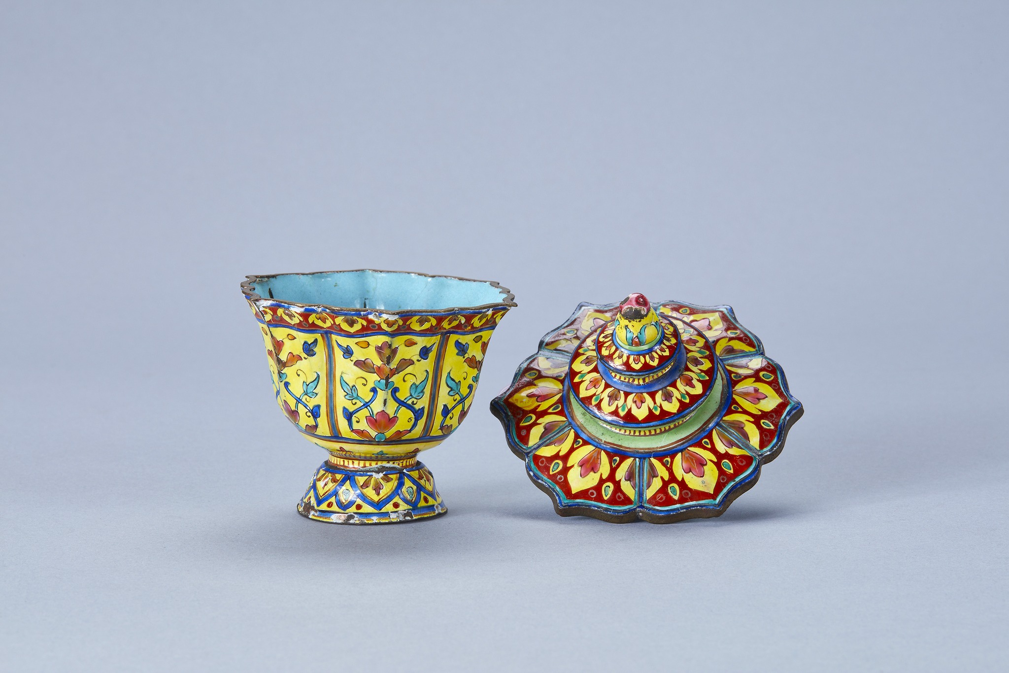 ผอบรูปทรงหกเหลี่ยม ขึ้นรูปจากโลหะทองแดงตกแต่งด้วยเทคนิคการถมปัด ปากผอบผายออกเล็กน้อย มีรูปทรงหยักโค้งคล้ายกลีบดอกไม้ ขอบปากผอบด้านนอกตกแต่งเป็นลายใบเทศบนพื้นสีแดง ตัวผอบเป็นทรงหกเหลี่ยม ผิวด้านนอกแบ่งเป็นลายช่องกระจกเขียนลายก้านต่อดอกใบเทศ เชิงผอบเป็นทรงกลมตกแต่งเป็นลายกลีบบัวคว่ำซ้อนกลีบ ภายในกลีบบัวมีลายใบเทศ ฝาผอบหยักโค้งเป็นรูปทรงคล้ายกลีบดอกไม้ (รับกับปากผอบ) ตกแต่งด้วยลายใบไม้บนพื้นสีแดง กึ่งกลางฝาเป็นจุกยอดแหลม