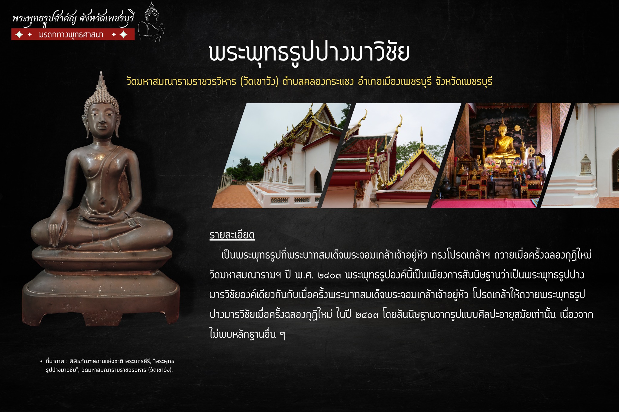 ประวัติ เป็นพระพุทธรูปที่พระบาทสมเด็จพระจอมเกล้าเจ้าอยู่หัว ทรงโปรดเกล้าฯ ถวายเมื่อครั้งฉลองกุฏิใหม่วัดมหาสมณารามฯ ปี พ.ศ. ๒๔๐๓ ตรงกับหลักฐานเอกสารจดหมายเหตุของหมอบรัดเลย์ว่า “. . . วันที่ ๒๒ มิถุนายน จ.ศ. ๑๒๒๒ แห่พระไปเมืองเพชร . . . วันที่ ๒๘ มิถุนายน เสด็จประพาสเมืองเพชรบุรี เป็นครั้งที่ ๓ การแห่พระนั้น ก็คือ การแห่พระสงฆ์ฝ่ายธรรมยุต จํานวน ๑๐ รูป จากวัดบวรนิเวศฯ ซึ่งมีพระใบฎีกาเอม ข้าหลวง เดิมในพระองค์เป็นชาวบ้านบางจาน เมืองเพชรบุรี ให้ออกไปครองวัดมหาสมณาราม เป็นที่พระครูมหาสมณวงศ์ กับพระอันดับอีก ๙ รูป พร้อมด้วยพระพุทธรูปปางมารวิชัยหนึ่งองค์ในการทําบุญฉลองกุฏิใหม่ และพระสงฆ์ที่ไปครองวัดมหาสมณารามนี้ ได้โปรดเกล้าฯ ให้พระยาเพชรบุรี กรมการเมือง เบิกเงินต่อกรมวังมาจัดของคาว - หวาน ถวายพระสงฆ์ เช้า คาว ๕ หวาน ๕ รวม ๑๐ สํารับ . . .”