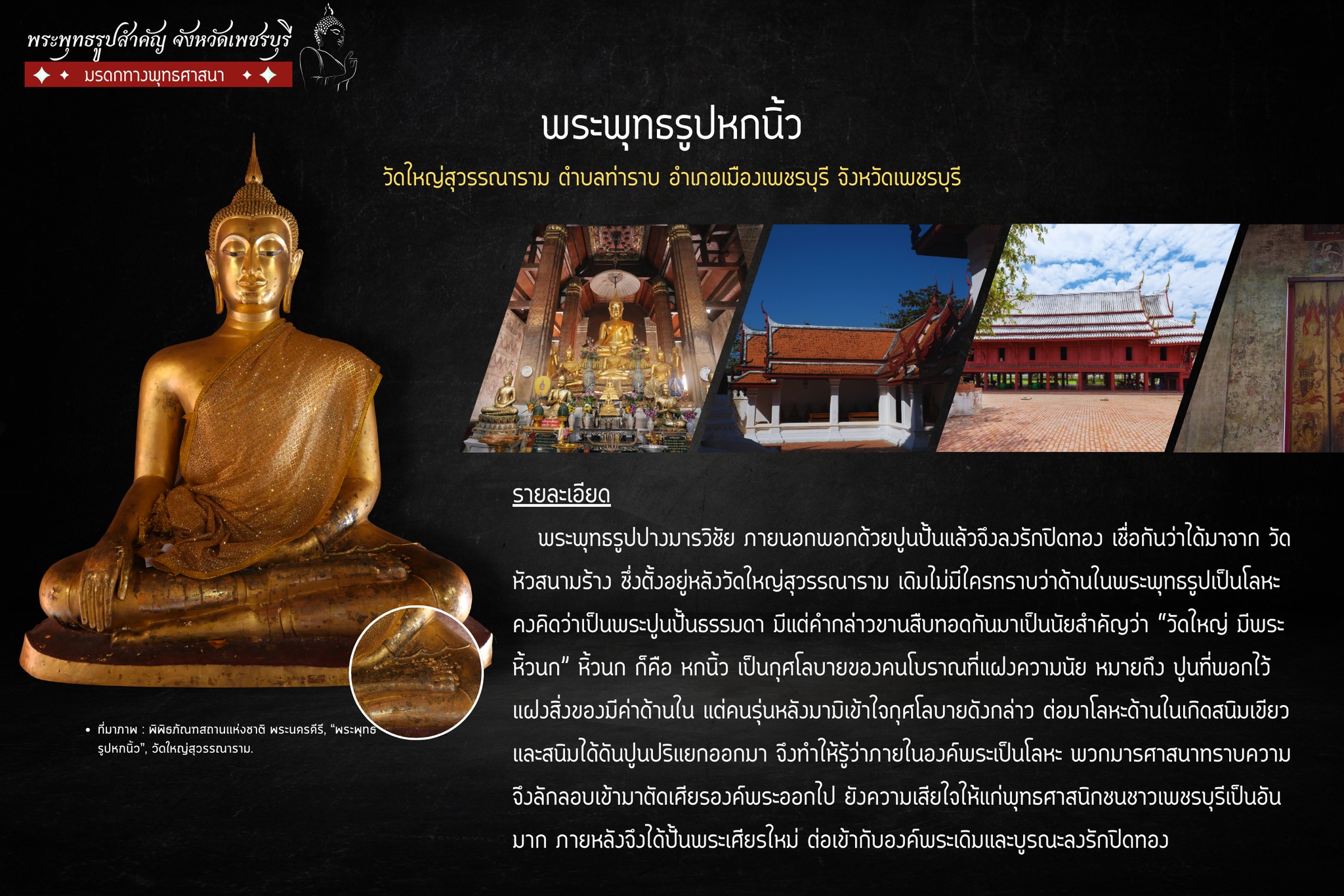 เดิมไม่มีใครทราบว่าด้านในพระพุทธรูปเป็นโลหะ คงคิดว่าเป็นพระปูนปั้นธรรมดา มีแต่คํากล่าวขานสืบทอดกันมาเป็นนัยสําคัญว่า “วัดใหญ่ มีพระหิ้วนก” หิ้วนก ก็คือ นิ้วพระบาทขวาเกินปกติ ถึง ๖ นิ้ว เป็นกุศโลบายของคนโบราณที่แฝงความนัย หมายถึง ปูนที่พอกไว้แฝงสิ่งของมีค่าด้านใน แต่คนรุ่นหลังมามิเข้าใจกุศโลบายดังกล่าว ต่อมาโลหะด้านในเกิดสนิมเขียวและสนิมได้ดันปูนปริแยกออกมา จึงทําให้รู้ว่าภายในองค์พระเป็นโลหะ พวกมารศาสนาทราบความ จึงลักลอบเข้ามาตัดเศียรองค์พระออกไป ยังความเสียใจให้แก่พุทธศาสนิกชนชาวเพชรบุรีเป็นอันมาก ภายหลังจึงได้ปั้นพระเศียรใหม่ ต่อเข้ากับองค์พระเดิมและบูรณะลงรักปิดทอง