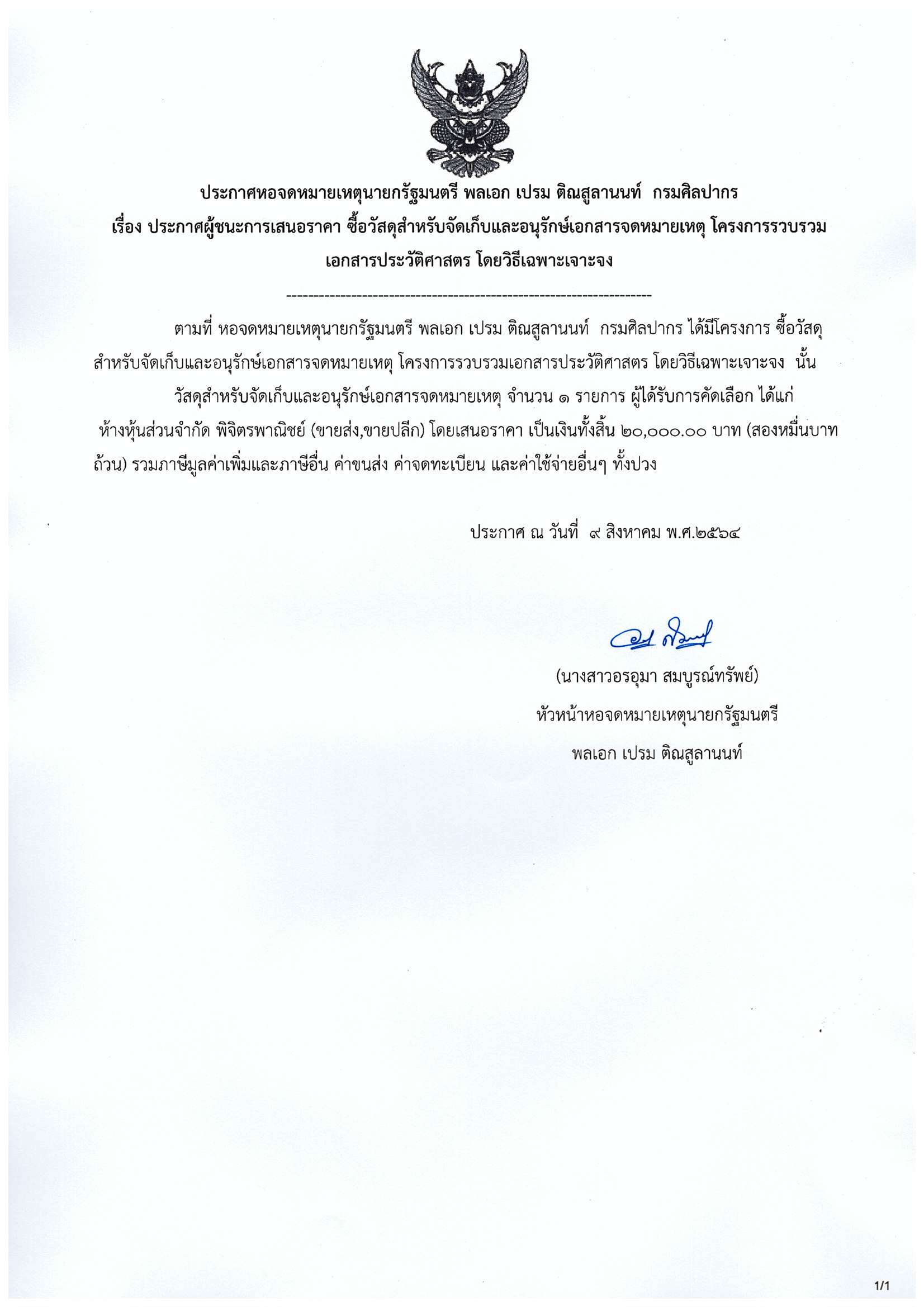 ประกาศ ผู้ชนะการเสนอราคา ซื้อวัสดุสำหรับจัดเก็บและอนุรักษ์เอกสารจดหมายเหตุ โครงการรวบรวมเอกสารประวัติศาสตร์ โดยวิธีเฉพาะเจาะจง