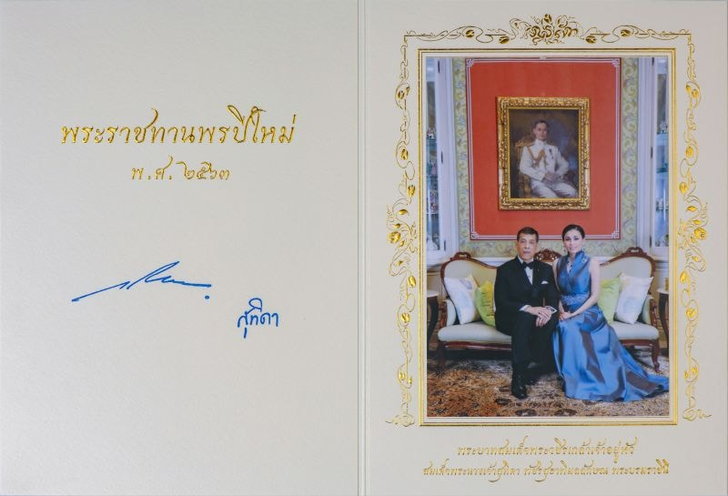 พระบาทสมเด็จพระเจ้าอยู่หัว และสมเด็จพระนางเจ้าฯ พระบรมราชินี พระราชทานบัตรอวยพรปีใหม่ ประจำปีพุทธศักราช ๒๕๖๓ แก่ปวงชนชาวไทย ด้านหน้าของบัตรพระราชทานพรปีใหม่ มีตราประจำพระราชวงศ์จักรีอยู่กึ่งกลาง ด้านล่างเป็นตราพระปรมาภิไธย วปร และตราพระนามาภิไธย สท