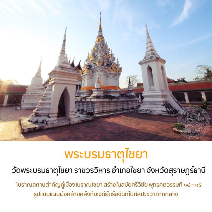 พระบรมธาตุไชยา วัดพระบรมธาตุไชยา ราชวรวิหาร ตำบลเวียง อำเภอไชยา จังหวัดสุราษฎร์ธานี (ปัจจุบันเป็นพระอารามหลวงชั้นเอกชนิดราชวรวิหาร) พระบรมธาตุไชยา เป็นโบราณสถานสำคัญของภาคใต้ ตั้งอยู่ในเมืองโบราณไชยา สร้างขึ้นในเนื่องในศาสนาพุทธนิกายมหายาน