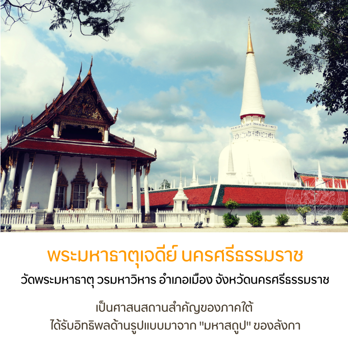 . //พระมหาธาตุเจดีย์นครศรีธรรมราช วัดพระมหาธาตุ วรมหาวิหาร ตำบลในเมือง อำเภอเมือง จังหวัดนครศรีธรรมราช เป็นศาสนสถานที่สำคัญของภาคใต้ มีตำนานระบุว่าสร้างขึ้นโดยพระเจ้าศรีธรรมาโศกราช เพื่อบรรจุพระบรมสารีริกธาตุ วัดพระมหาธาตุ เดิมเป็นวัดที่ไม่มีพระสงฆ์จำพรรษา ต่อมาในปี พ.ศ. ๒๔๕๘ พระบาทสมเด็จพระมงกุฎเกล้าเจ้าอยู่หัว รัชกาลที่ ๖ ทรงสถาปนาวัดเป็นพระอารามหลวงชั้นเอก พระราชทานนามว่า “วัดพระมหาธาตุ วรมหาวิหาร”