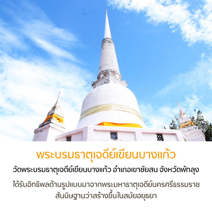 พระบรมธาตุเจดีย์เขียนบางแก้ว วัดเขียนบางแก้ว ปัจจุบันได้เปลี่ยนชื่อเป็น "วัดพระบรมธาตุเจดีย์เขียนบางแก้ว" ตำบลจองถนน อำเภอเขาชัยสน จังหวัดพัทลุง เป็นวัดโบราณ จากหลักฐานเอกสารตำนานพื้นเมืองระบุว่า เจ้าพระยากุมารกับนางเลือดขาวสร้างเสร็จเมื่อปี พ.ศ.๑๔๙๒ และได้อัญเชิญพระบรมสารีริกธาตุจากเกาะลังกามาบรรจุไว้ในพระมหาธาตุเจดีย์ แต่บางตำนานกล่าวว่า เจ้าพระยากรุงทองเจ้าเมืองสทิงพระพาราณสีเป็นผู้สร้างพระมหาธาตุเจดีย์ จึงเข้าใจว่าน่าจะสร้างวัดขึ้นพร้อมกันในคราวนั้น เมื่อกรุงศรีอยุธยาเสียแก่พม่าครั้งที่ ๒ ในปี พ.ศ. ๒๓๑๐ วัดเขียนบางแก้วกลายเป็นวัดร้าง กระทั่งมีการบูรณะขึ้นใหม่ในปลายสมัยรัชกาลที่ ๕ แห่งกรุงรัตนโกสินทร์ จึงมีพระสงฆ์จำพรรษาอยู่มาตราบจนปัจจุบัน