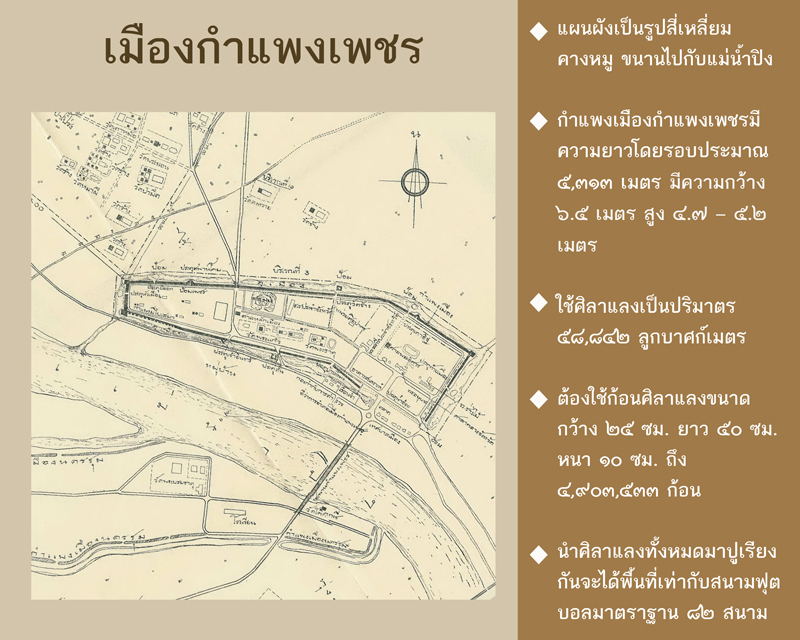 ศิลาจารึกวัดศรีพิจิตรกีรติกัลยาราม (พ.ศ. ๑๙๔๗) ระบุชื่อเมืองพชรบุรีศรีกำแพงเพชร อันน่าจะหมายถึงเมืองโบราณกำแพงเพชรที่ตั้งอยู่ทางฝั่งตะวันออกของแม่น้ำปิง มีแผนผังเมืองเป็นรูปสี่เหลี่ยมคางหมู วางตัวขนานไปกับแม่น้ำปิง ตัวเมืองมีขนาดกว้างประมาณ ๖๐๐ เมตร ยาวประมาณ ๒,๔๒๐ เมตร แนวกำแพงเมืองด้านเหนือพบร่องรอยคูน้ำและคันดินจำนวน ๓ ชั้น จึงสันนิษฐานได้ว่าสร้างกำแพงเมืองกำแพงเพชรมีลักษณะเป็นคูน้ำและคันดิน ต่อมาได้มีการพัฒนากำแพงเมืองชั้นในให้เป็นกำแพงก่อด้วยศิลาแลง กำแพงเมืองชั้นในที่ล้อมรอบตัวเมืองเป็นระยะทางทั้งสิ้น ๕,๓๑๓ เมตร แบ่งเป็นกำแพงด้านทิศเหนือยาวประมาณ ๒,๔๐๓ เมตร กำแพงด้านทิศใต้ยาวประมาณ ๒,๑๕๐ ด้านทิศตะวันออกยาวประมาณ ๕๔๐ เมตร และด้านทิศตะวันตกยาวประมาณ ๒๒๐ เมตร แนวกำแพงมีความกว้าง ๖.๕ เมตร สูงประมาณ ๔.๗ – ๕.๒ เมตร