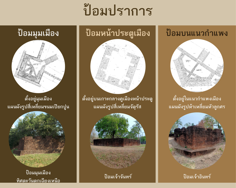 ๑. ป้อมประจำมุมเมือง ปัจจุบันพบเพียง ๓ ป้อม ตั้งอยู่บริเวณมุมเมืองทั้ง ๓ มุม ในแนวเดียวกับกำแพงเมืองชั้นใน มีแผนผังเป็นรูปสี่เหลี่ยมขนมเปียกปูน ได้แก่ ป้อมมุมเมืองทิศตะวันออกเฉียงเหนือ ป้อมมุมเมืองทิศตะวันตกเฉียงเหนือ และป้อมมุมเมืองทิศตะวันตกเฉียงใต้