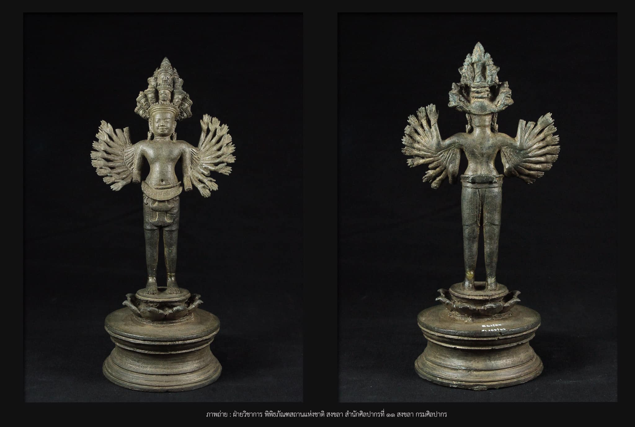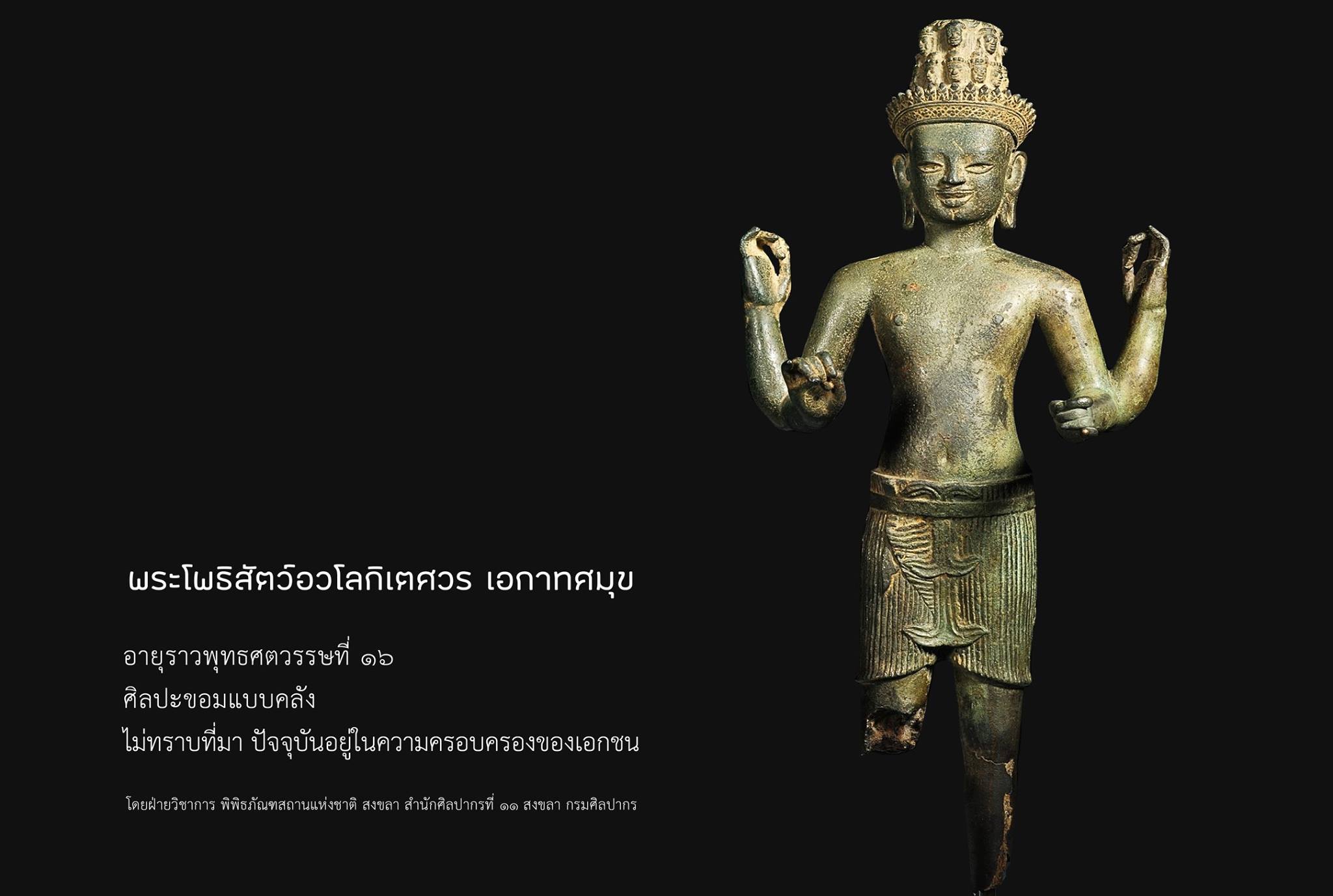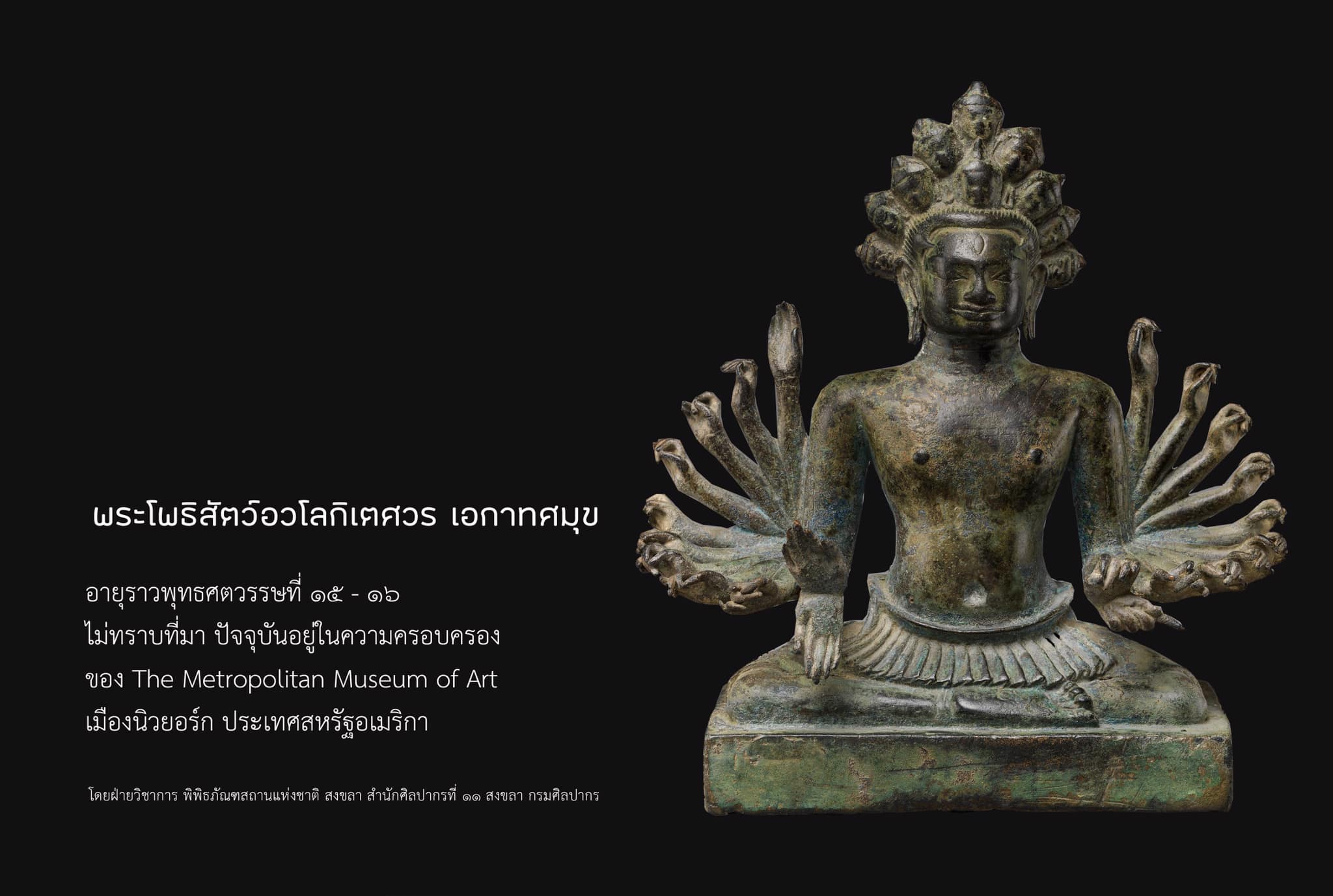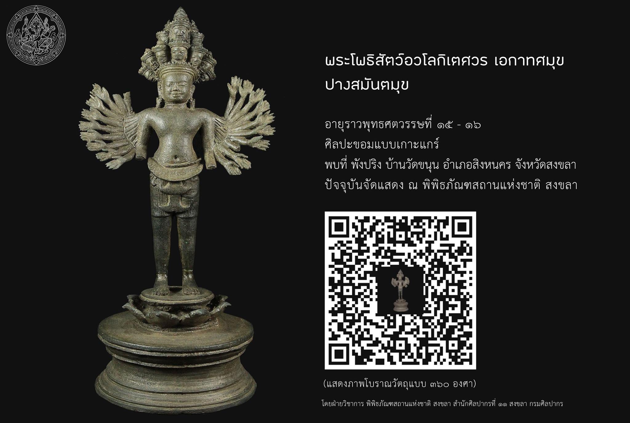 ในบริเวณภาคใต้ของประเทศไทย ปรากฏรูปเคารพพระโพธิสัตว์อวโลกิเตศวรหลายรูปแบบผ่านการนับถือพุทธศาสนานิกายวัชรยานหรือตันตรยาน โดยนิกายดังกล่าวได้เข้ามามีอิทธิพลต่อศิลปะและวัฒนธรรมของผู้คนในคาบสมุทรสทิงพระ และดินแดนใกล้เคียงเป็นอย่างมากในช่วงพุทธศตวรรษที่ 14 - 15 อันเป็นช่วงที่เมืองสทิงพระมีความเจริญรุ่งเรืองจากการเป็นเมืองท่าค้าขายกับนานาชาติ อย่างไรก็ตาม พระโพธิสัตว์อวโลกิเตศวรในรูปแบบดังกล่าว กลับปรากฏน้อยมากในภูมิภาคเอเชียตะวันออกเฉียงใต้ จากการศึกษาของ Phillip Scott Ellis Green ซึ่งตีพิมพ์ในวารสาร History of Religions โดย The University of Chicago Press ระบุว่า พบประติมากรรมพระโพธิสัตว์ในรูปแบบดังกล่าว ซึ่งกำหนดอายุอยู่ในช่วงพุทธศตวรรษที่ 15 - 16 มีจำนวนทั้งสิ้น 4 องค์ ได้แก่ 1. พระโพธิสัตว์อวโลกิเตศวรทรงยืน 11 เศียร 22 กร อันมีรูปแบบศิลปกรรมที่ได้รับอิทธิพลจากศิลปะขอมสมัยเกาะแกร์ (Koh Ker) ช่วงปลายพุทธศตวรรษที่ 15 พบที่ บ้านวัดขนุน อำเภอสิงหนคร จังหวัดสงขลา ปัจจุบันจัดแสดง ณ พิพิธภัณฑสถานแห่งชาติ สงขลา 2. พระโพธิสัตว์อวโลกิเตศวร ทรงยืน 11 เศียร 4 กร ไม่ทราบที่มา กำหนดอายุอยู่ในศิลปะขอมแบบคลัง (Khleang) ราวต้นพุทธศตวรรษที่ 16 ปัจจุบันอยู่ในความครอบครองของเอกชน 3. พระโพธิสัตว์อวโลกิเตศวร ทรงยืน 11 เศียร 4 กร ไม่ทราบที่มา ศิลปะขอมกำหนดอายุในช่วงประมาณพุทธศตวรรษที่ 16 ข้อมูลระบุว่าถูกขายด้วยการประมูลโดยบริษัท คริสตีส์ (Christie's art) 4. พระโพธิสัตว์อวโลกิเตศวร 11 เศียร 22 กร ทว่าอยู่ในอิริยาบถประทับนั่งขัดสมาธิเพชร ศิลปะขอม อายุประมาณพุทธศตวรรษที่ 15 - 16 ซึ่งถูกซื้อโดย The Metropolitan Museum of Art เมืองนิวยอร์ก ประเทศสหรัฐอเมริกา