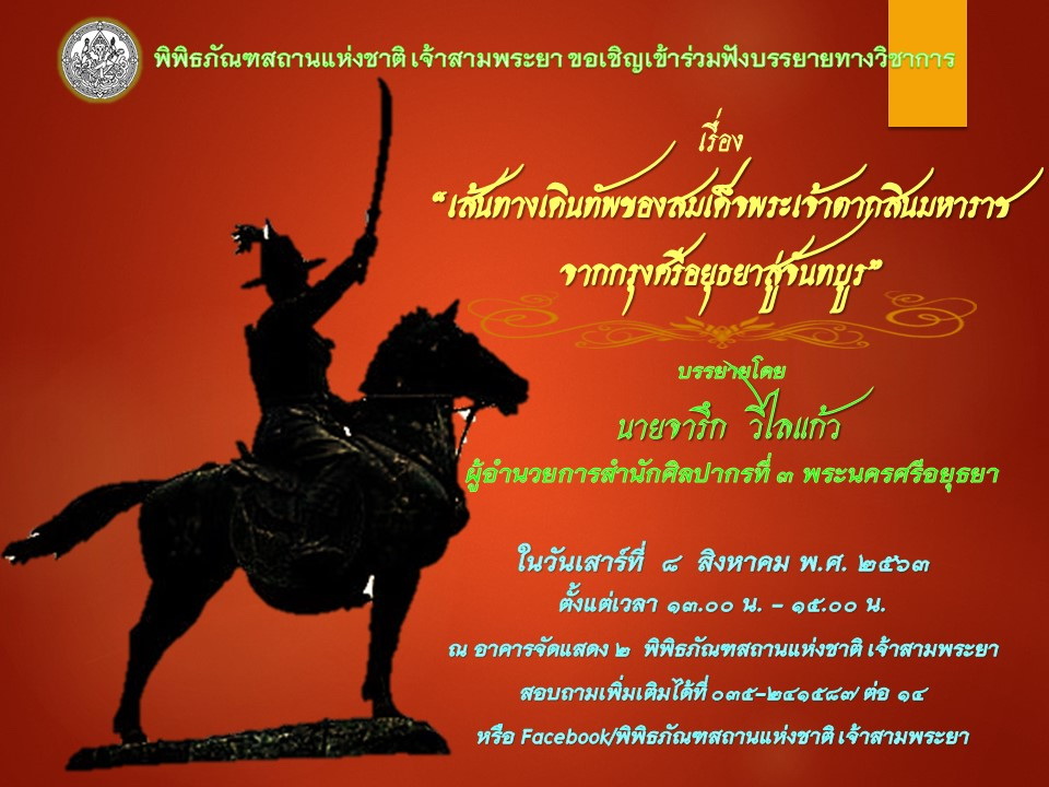 พิพิธภัณฑสถานแห่งชาติ เจ้าสามพระยา ขอเชิญร่วมกิจกรรมบรรยายความรู้ทางด้านประวัติศาสตร์ โบราณคดีและการจัดกิจกรรมด้านศิลปวัฒนธรรม ประจำปีงบประมาณ ๒๕๖๓ ครั้งที่ ๕ เรื่อง “เส้นทางเดินทัพของสมเด็จพระเจ้าตากสินมหาราช จากกรุงศรีอยุธยาสู่จันทบูร" บรรยายโดยนายจารึก วิไลแก้ว ผู้อำนวยการสำนักศิลปากรที่ ๓ พระนครศรีอยุธยา ในวันเสาร์ที่ ๘ สิงหาคม ๒๕๖๓ ตั้งแต่เวลา ๑๓.๐๐–๑๕.๐๐น. ณ อาคารจัดแสดง ๒ พิพิธภัณฑสถานแห่งชาติ เจ้าสามพระยา