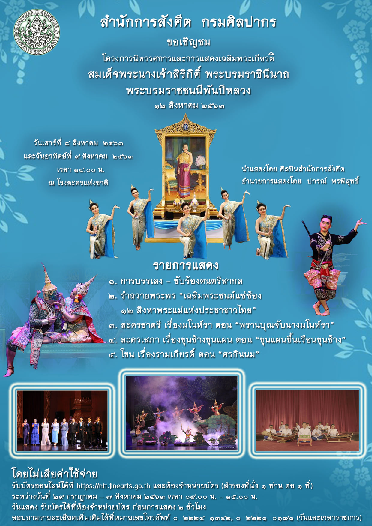 กรมศิลปากร กระทรวงวัฒนธรรม ขอเชิญชมการแสดงเฉลิมพระเกียรติสมเด็จพระนางเจ้าสิริกิติ์ พระบรมราชินีนาถ พระบรมราชชนนีพันปีหลวง ๑๒ สิงหาคม ๒๕๖๓ ในวันที่ ๘ - ๙ สิงหาคม ๒๕๖๓ ณ โรงละคร แห่งชาติ โดยไม่เสียค่าใช้จ่าย