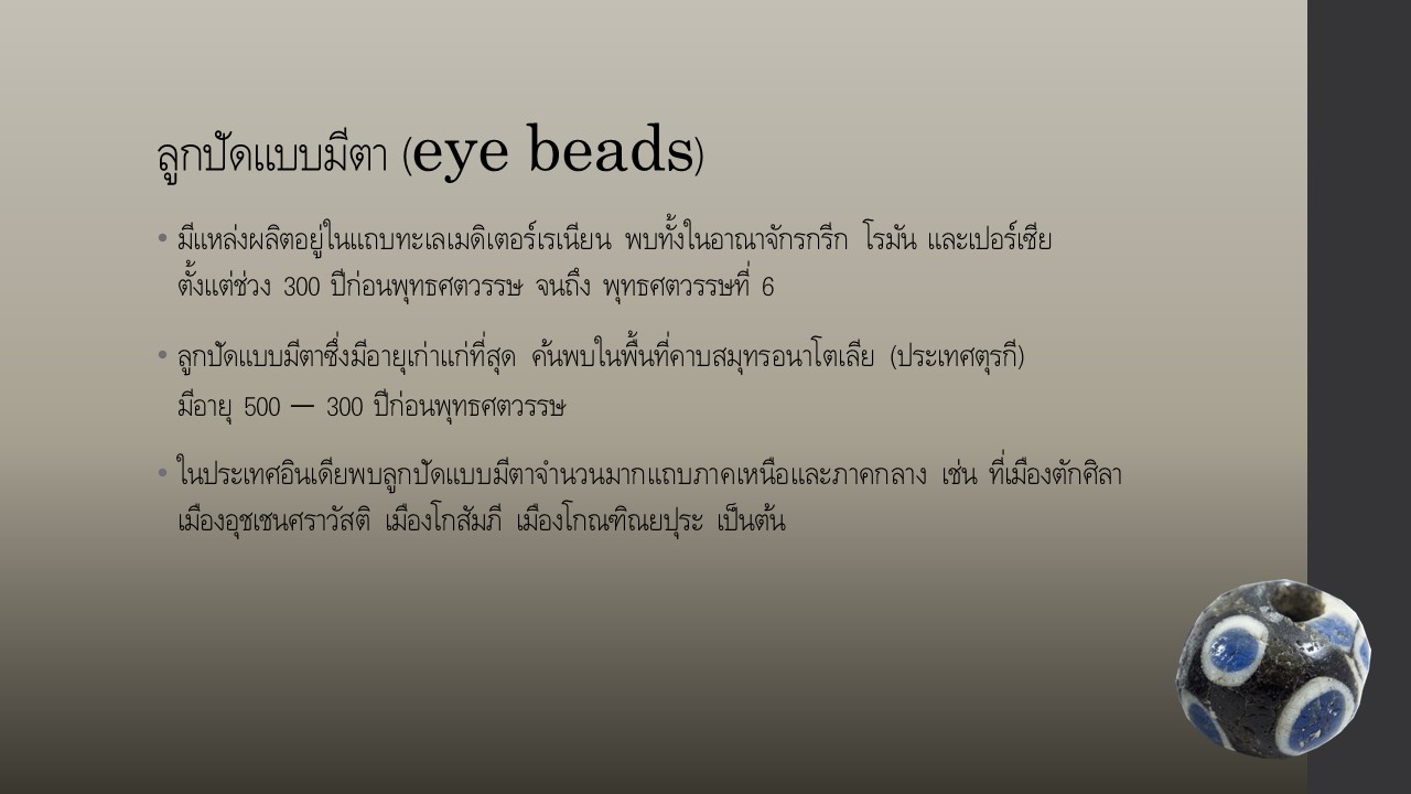 ลูกปัดแบบมีตามีแหล่งผลิตในแถบเมดิเตอร์เรเนียนในอาณาจักรกรีก โรมัน และเปอร์เซีย (ตั้งแต่ช่วง ๓๐๐ ปีก่อนพุทธศตวรรษ - พุทธศตวรรษที่ ๖) ลูกปัดแบบมีตาที่เก่าแก่ที่สุดที่พบในพื้นที่คาบสมุทรอนาโตเลีย มีอายุถึง ๕๐๐-๓๐๐ ปีก่อนพุทธศตวรรษ และได้พบลูกปัดรูปแบบนี้ในอินเดียซึ่งพบมากในภาคเหนือและภาคกลางในช่วงพุทธศตวรรษที่ ๓ – ๗ เมืองโบราณของอินเดียที่พบลูกปัดมีตา คือ ตักศิลา อุชเชนศราวัสติ โกสัมภี และโกณฑิณยปุระ เป็นต้น ลูกปัดมีตาที่พบในอินเดียแสดงให้เห็นถึงการติดต่อค้าขายกับกรีก-โรมัน เปอร์เชีย สำหรับในประเทศไทยได้พบลูกปัดมีตาในแหล่งโบราณคดีสมัยแรกเริ่มประวัติศาสตร์ซึ่งมีอายุสมัยอยู่ในช่วงพุทธศตวรรษที่ ๓-๕ โดยมักจะพบร่วมกับลูกปัดหินคาร์เนเลียนและอาเกต และยังพบในเมืองท่าโบราณทางภาคใต้ที่แหล่งโบราณคดีคลองท่อม (ควนลูกปัด) จังหวัดกระบี่ แหล่งโบราณคดีทุ่งตึก (เหมืองทอง) จังหวัดพังงา และแหลมโพธิ์ จังหวัดสุราษฏร์ธานี