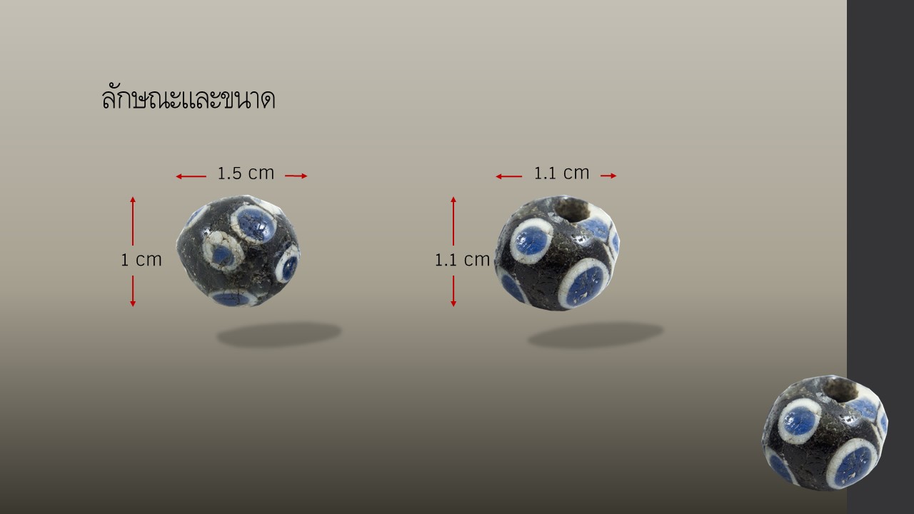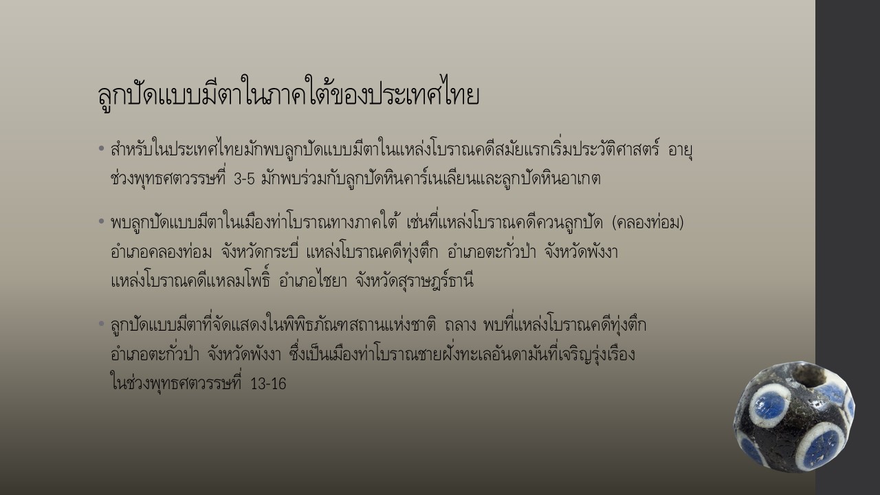 สำหรับลูกปัดมีตาซึ่งเก็บรักษาที่พิพิธภัณฑสถานแห่งชาติ ถลาง พบที่แหล่งโบราณคดีทุ่งตึก ต.เกาะคอเขา อ.ตะกั่วป่า จ.พังงา ซึ่งเป็นเมืองท่าโบราณในฝั่งอันดามัน เจริญอยู่ในช่วงพุทธศตวรรษที่ ๑๓ – ๑๖ และยังพบลูกปัดมีตาในฝั่งอ่าวไทยที่แหล่งโบราณคดีแหลมโพธิ์ จังหวัดสุราษฏร์ธานีซึ่งเป็นเมืองท่าที่เจริญอยู่ในช่วงพุทธศตวรรษที่ ๑๒ – ๑๕ ลูกปัดมีตาจึงเป็นหลักฐานสำคัญที่แสดงให้เห็นถึงการติดต่อระหว่างเมืองท่าโบราณในภาคใต้และเมืองท่าของอินเดียซึ่งมีมาตั้งแต่ช่วงพุทธศตวรรษที่ ๓–๕ รวมถึงในช่วงพุทธศตวรรษที่ ๑๓ – ๑๖