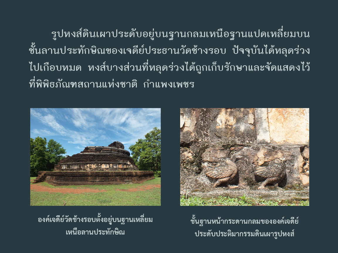 ประติมากรรมดินเผารูปหงส์พบจากการขุดแต่งโบราณสถานวัดช้างรอบ เขตอรัญญิก นอกเมืองกำแพงเพชรทางด้านเหนือ ใช้ประดับอยู่ที่ส่วนฐานกลมเหนือฐานแปดเหลี่ยมบนชั้นลานประทักษิณของเจดีย์ประธานวัดช้างรอบ ปัจจุบันได้หลุดร่วงไปเกือบหมด หงส์บางส่วนที่หลุดร่วงได้ถูกเก็บรักษาและจัดแสดงไว้ที่พิพิธภัณฑสถานแห่งชาติ กำแพงเพชร
