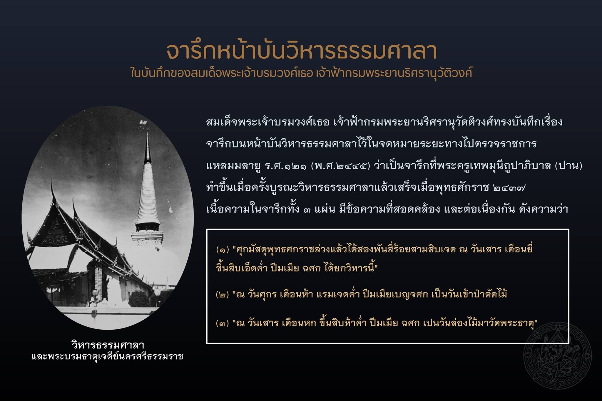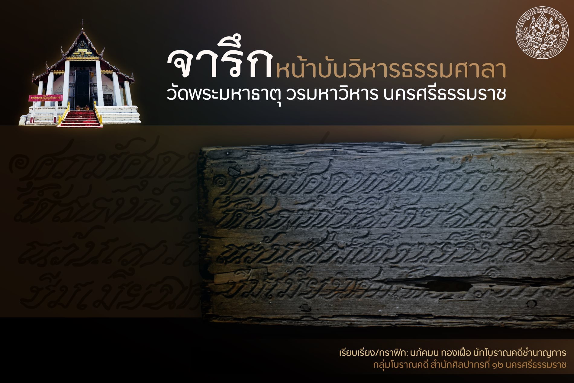 สืบเนื่องจากองค์ความรู้ชุด “วิหารธรรมศาลา : พระวิหารสมัยอยุธยา วัดพระมหาธาตุวรมหาวิหาร นครศรีธรรมราช” ซึ่งได้กล่าวถึงจารึกหน้าบันวิหารธรรมศาลา ๓ แผ่น และข้อสันนิษฐานว่าจารึกแผ่นที่ ๓ อาจสลักขึ้นใหม่ เนื่องจากข้อความในจารึกไม่สอดคล้องกับหลักฐานเอกสาร คือบันทึกของสมเด็จพระเจ้าบรมวงศ์เธอ เจ้าฟ้ากรมพระยานริศรานุวัติวงศ์ ซึ่งได้คัดลอกข้อความในจารึกหน้าบันวิหารธรรมศาลาไว้เมื่อครั้งตรวจราชการเมืองนครศรีธรรมราชใน ร.ศ.๑๒๑ (พุทธศักราช ๒๔๔๕) นั้น