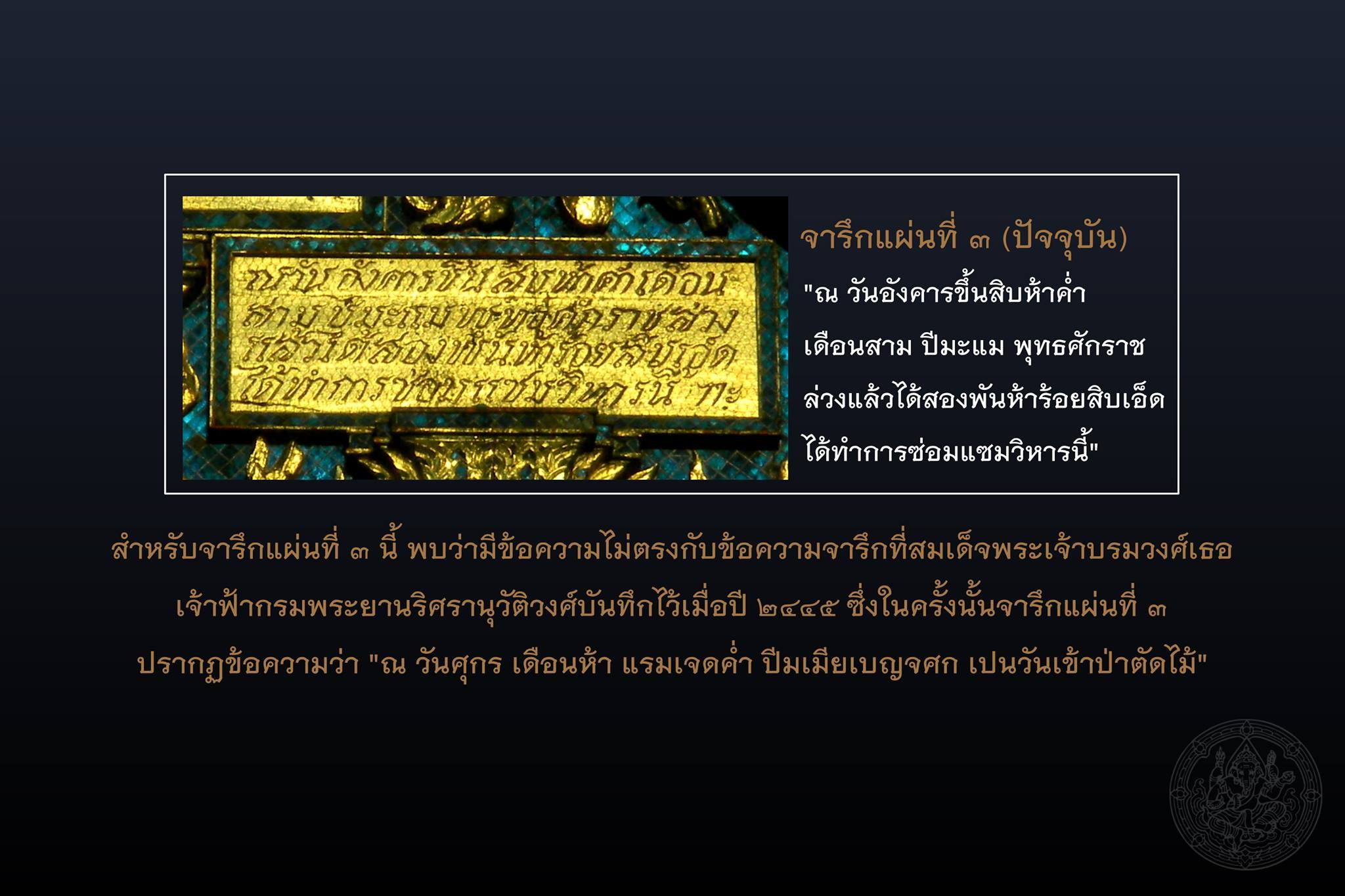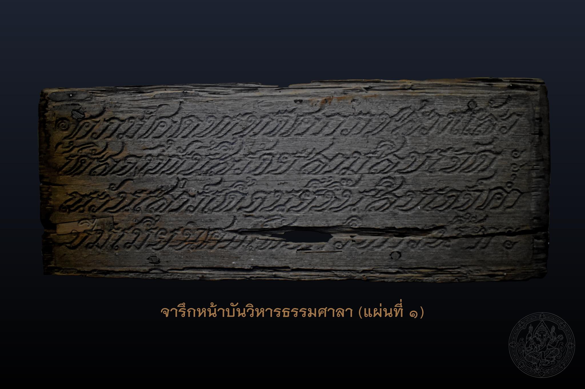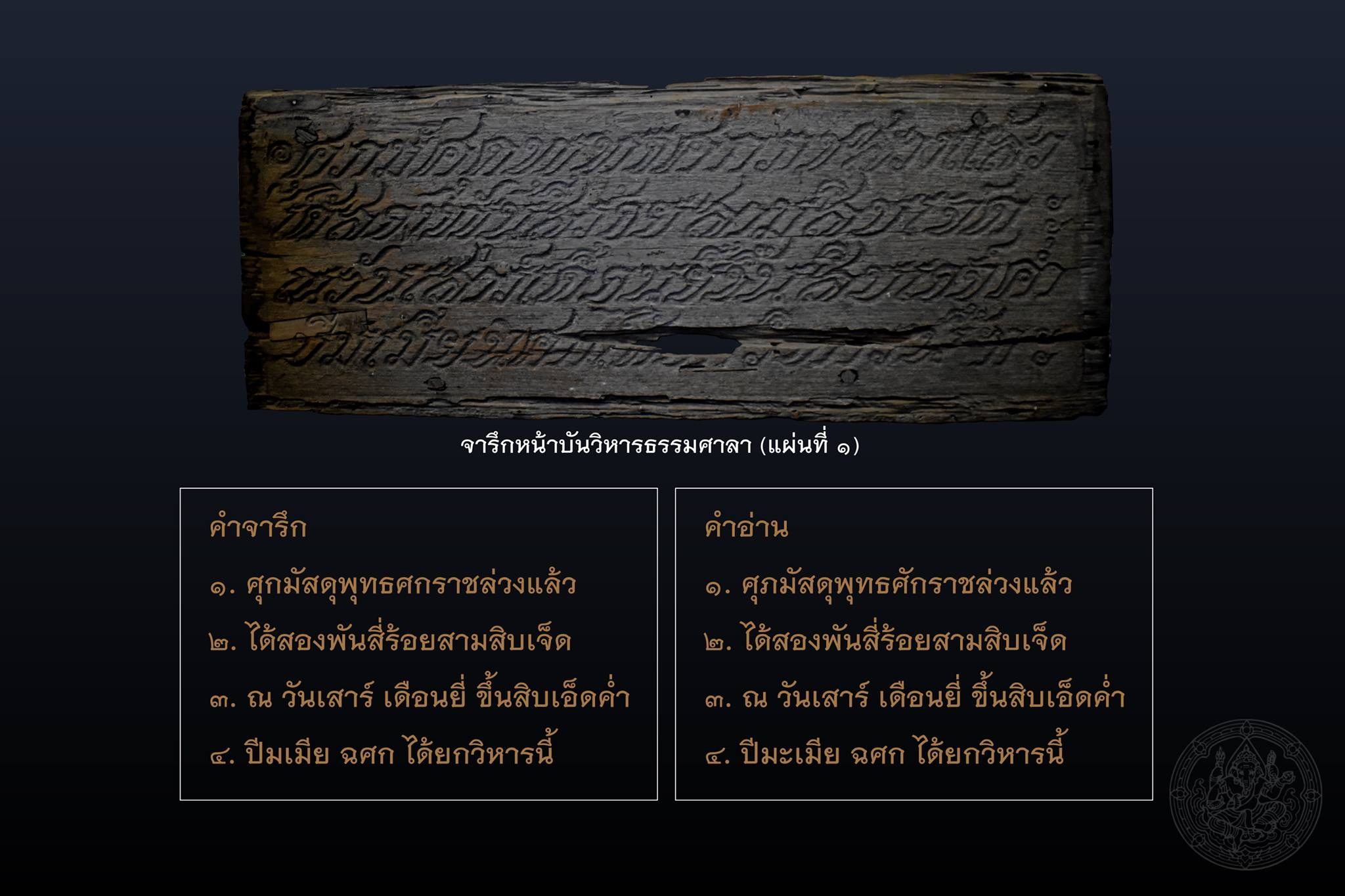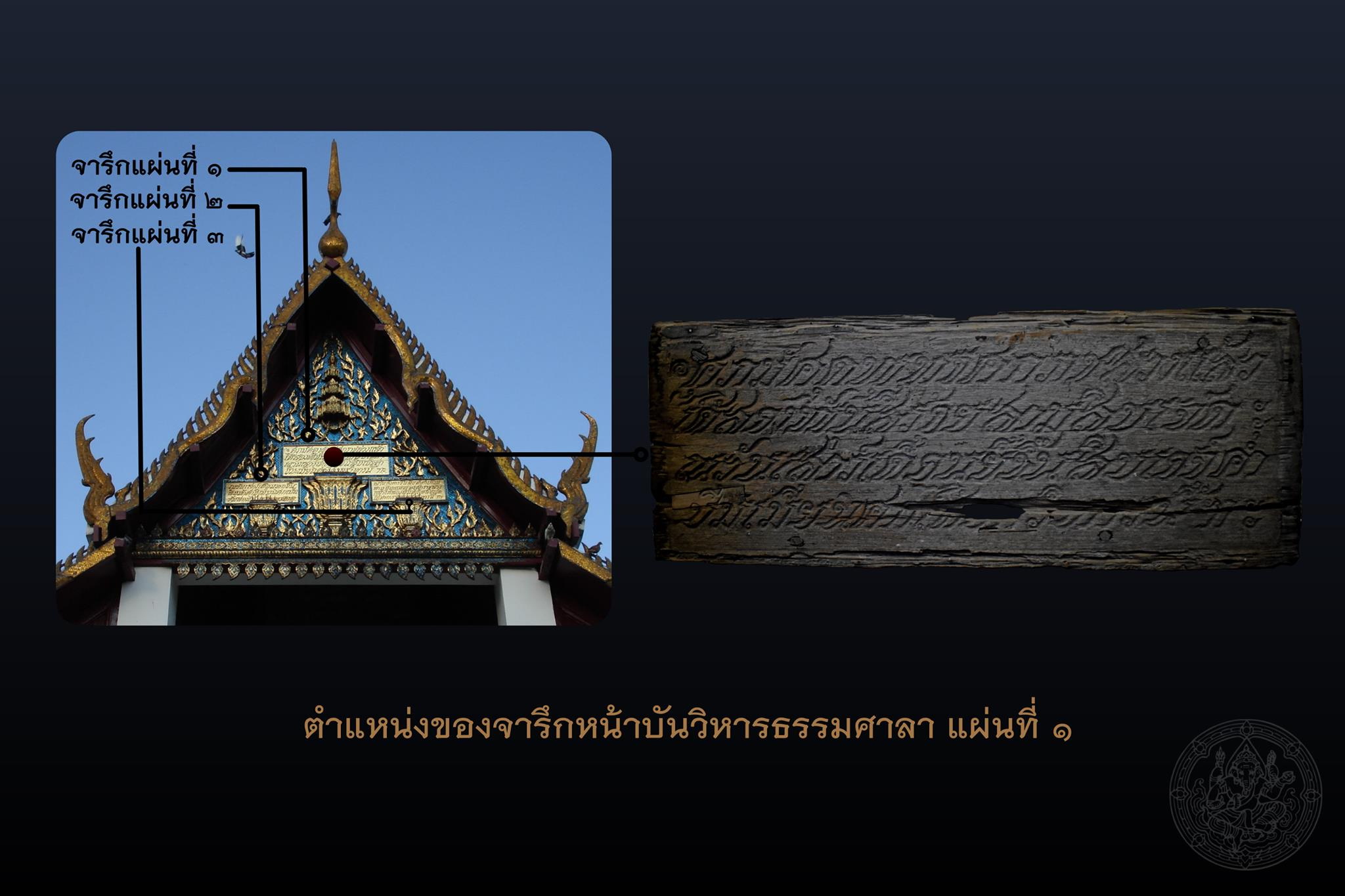 จากข้อสันนิษฐานดังกล่าว นำมาสู่การค้นพบข้อมูลสำคัญอีกประการหนึ่งว่า แท้จริงแล้ว จารึกทั้ง ๓ แผ่น น่าจะถูกถอดลงเมื่อครั้งบูรณะวิหารธรรมศาลาในปีพุทธศักราช ๒๕๑๑ แล้วคัดลอกใหม่ทั้งหมดเพื่อแทนที่ของเดิมที่มีสภาพผุพัง เนื่องจากได้พบ “จารึกหน้าบันวิหารธรรมศาลา” แผ่นที่ ๑ ซึ่งเป็นจารึกแผ่นเดิมที่สลักขึ้นเมื่อพุทธศักราช ๒๔๓๗ ในสมัยพระบาทสมเด็จพระจุลจอมเกล้าเจ้าอยู่หัว (รัชกาลที่ ๕)