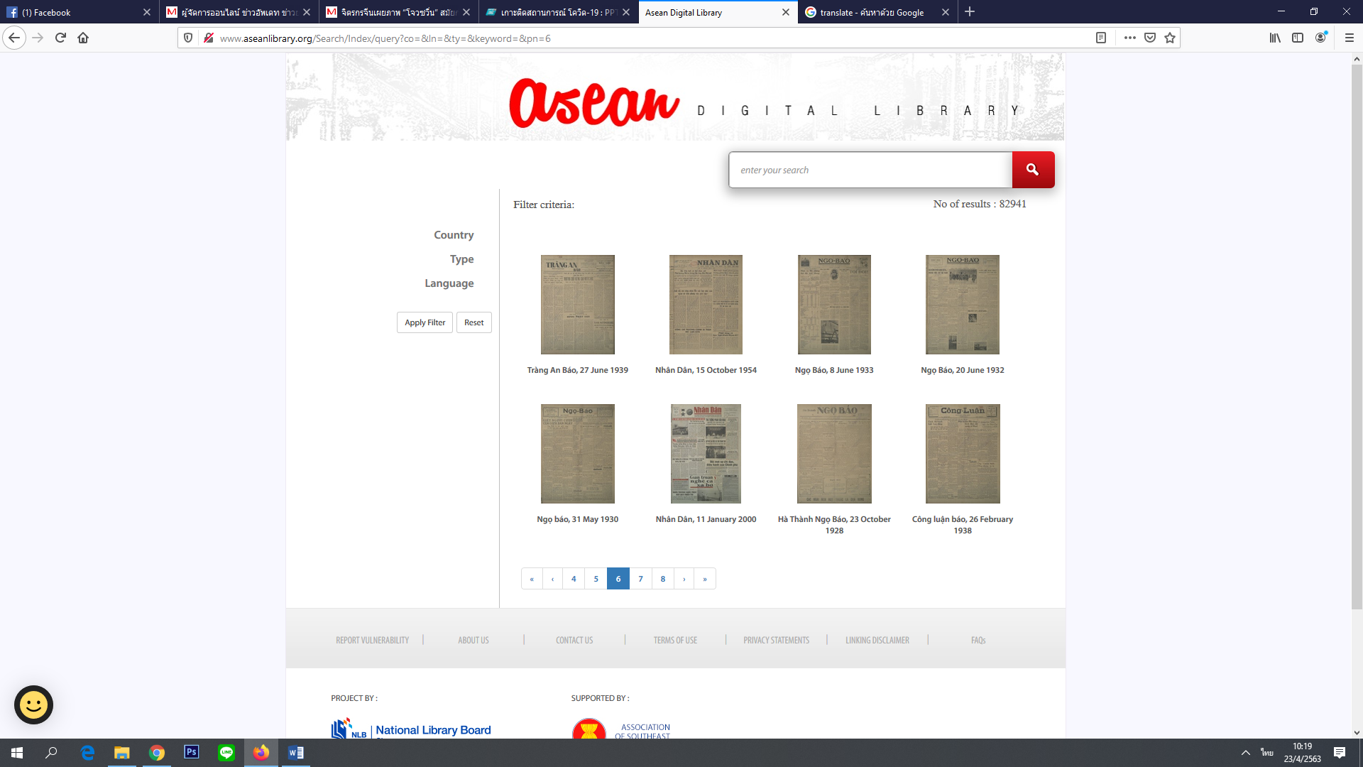 รูปที่ 2 หน้าสืบค้นเว็บไซต์ห้องสมุดดิจิทัลแห่งชาติอาเซียน (ASEAN Digital Library) สามารถสืบค้นโดยวิธีการค้นโดยใส่ คำสำคัญหรือคำค้น สืบค้นโดยวิธีเลือกจากประเทศ ประเภท และภาษา