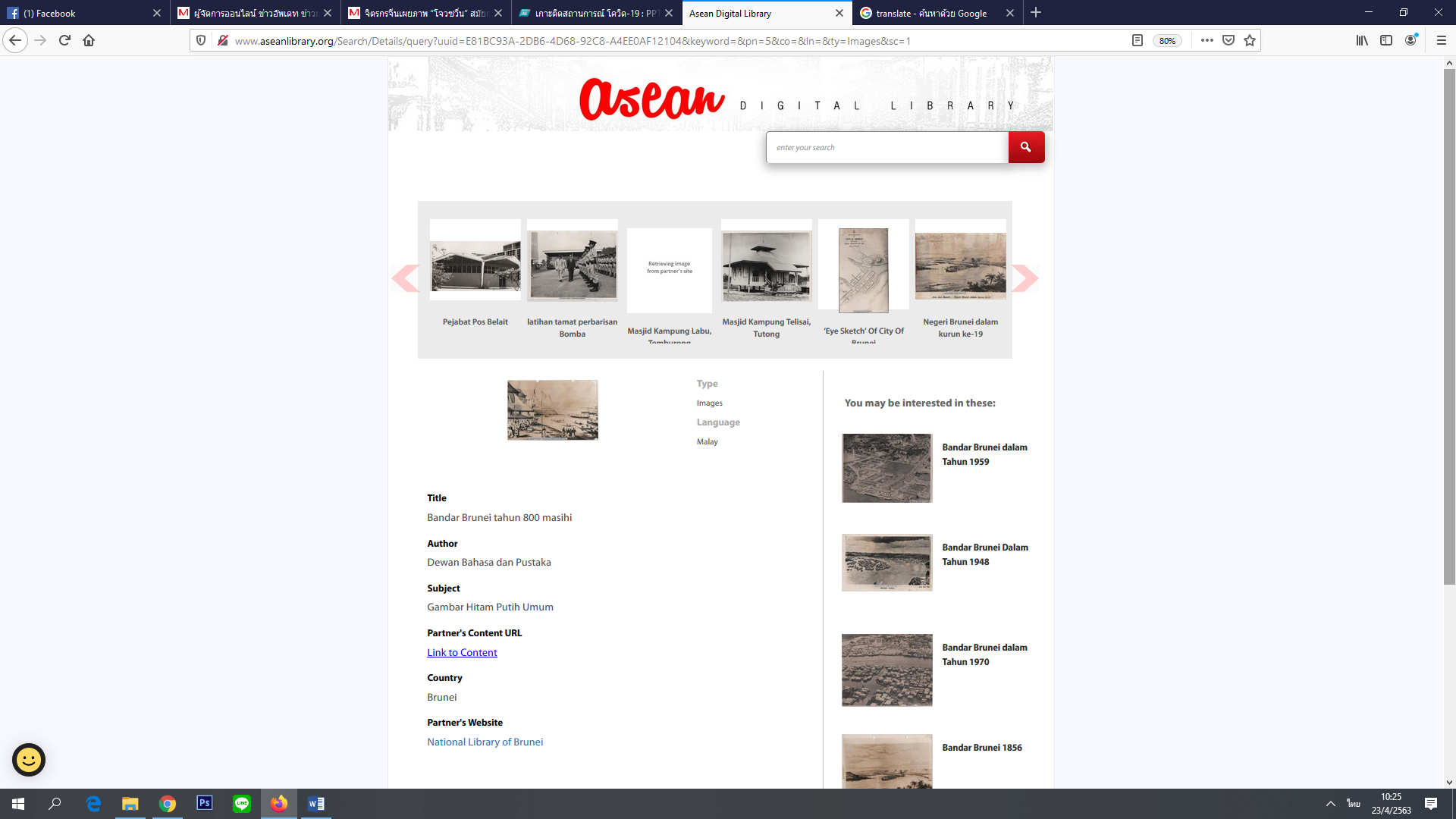 รูปที่ 4 ตัวอย่างภาพแสดงผลการสืบค้นรายละเอียดทางบรรณานุกรมภาพเก่าประวัติศาสตร์ของประเทศบูรไนดารุสซาลาม พร้อมกับเมนูลิงค์เชื่อมโยงไปสู่เนื้อหาดิจิทัลในระบบห้องสมุดดิจิทัลของหอสมุดแห่งชาติบูรไน