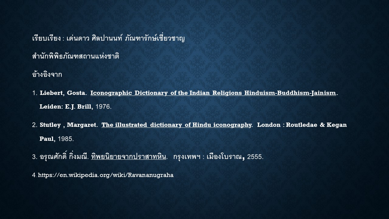 องค์ความรู้ เรื่อง เล่าเรื่องประติมานวิทยา : ราวณานุครหมูรติ เรียบเรียงโดย นางสาวเด่นดาว ศิลปานนท์ ภัณฑารักษ์เชี่ยวชาญ สำนักพิพิธภัณฑสถานแห่งชาติ