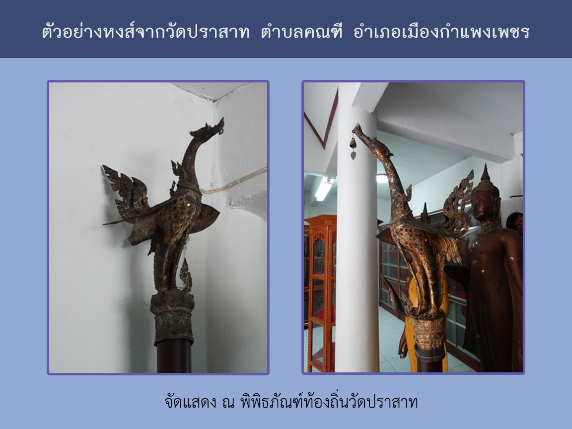 - กัญญรัตน์ เวชชศาสตร์. การศึกษาเรื่องหงส์จากศิลปกรรมในประเทศไทย. กรุงเทพฯ : คุรุสภา, ๒๕๕๐. - ศิลปากร, กรม. นำชมพิพิธภัณฑสถานแห่งชาติ กำแพงเพชร. กรุงเทพฯ : รุ่งศิลป์การพิมพ์, ๒๕๕๗.