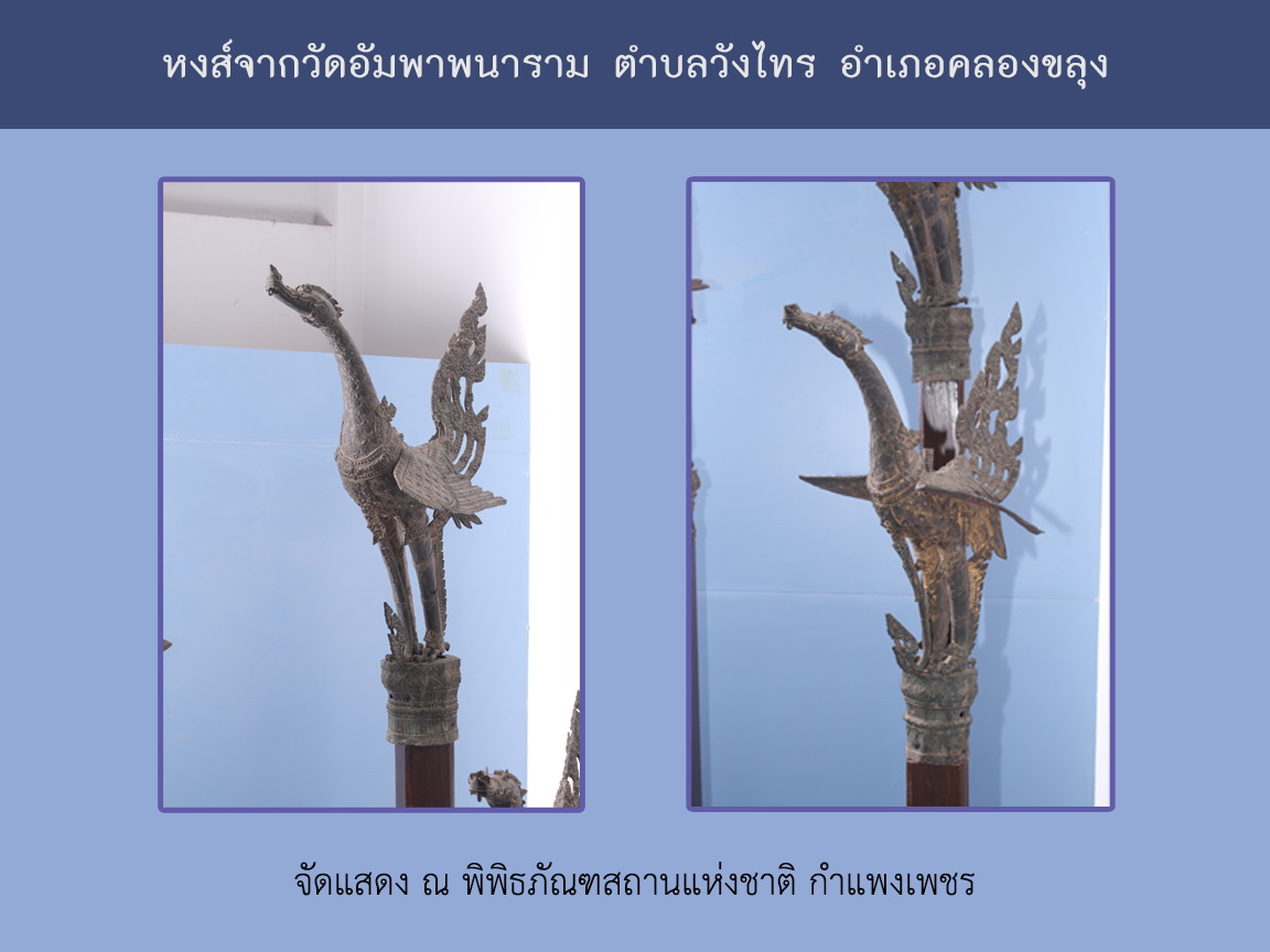 ประติมากรรมรูปหงส์ประดับบนยอดเสาที่พบในจังหวัดกำแพงเพชร ได้แก่ วัดหงษ์ทอง ตำบลสลกบาตร อำเภอขาณุวรลักษบุรี วัดปราสาท ตำบลคณฑี อำเภอเมืองกำแพงเพชร และวัดอัมพาพนาราม (วัดวังไทร) ตำบลวังไทร อำเภอคลองขลุง ซึ่งหงส์ประดับยอดเสาของวัดอัมพาพนารามได้จัดแสดง ณ พิพิธภัณฑสถานแห่งชาติ กำแพงเพชร โดยพระครูบาน บุญญโชโต เจ้าอาวาสวัดอัมพาพนารามขณะนั้น มอบให้เมื่อวันที่ ๒๖ ตุลาคม ๒๕๓๕ กำหนดอายุอยู่ในช่วงพุทธศตวรรษที่ ๒๔ – ๒๕ ศิลปะรัตนโกสินทร์