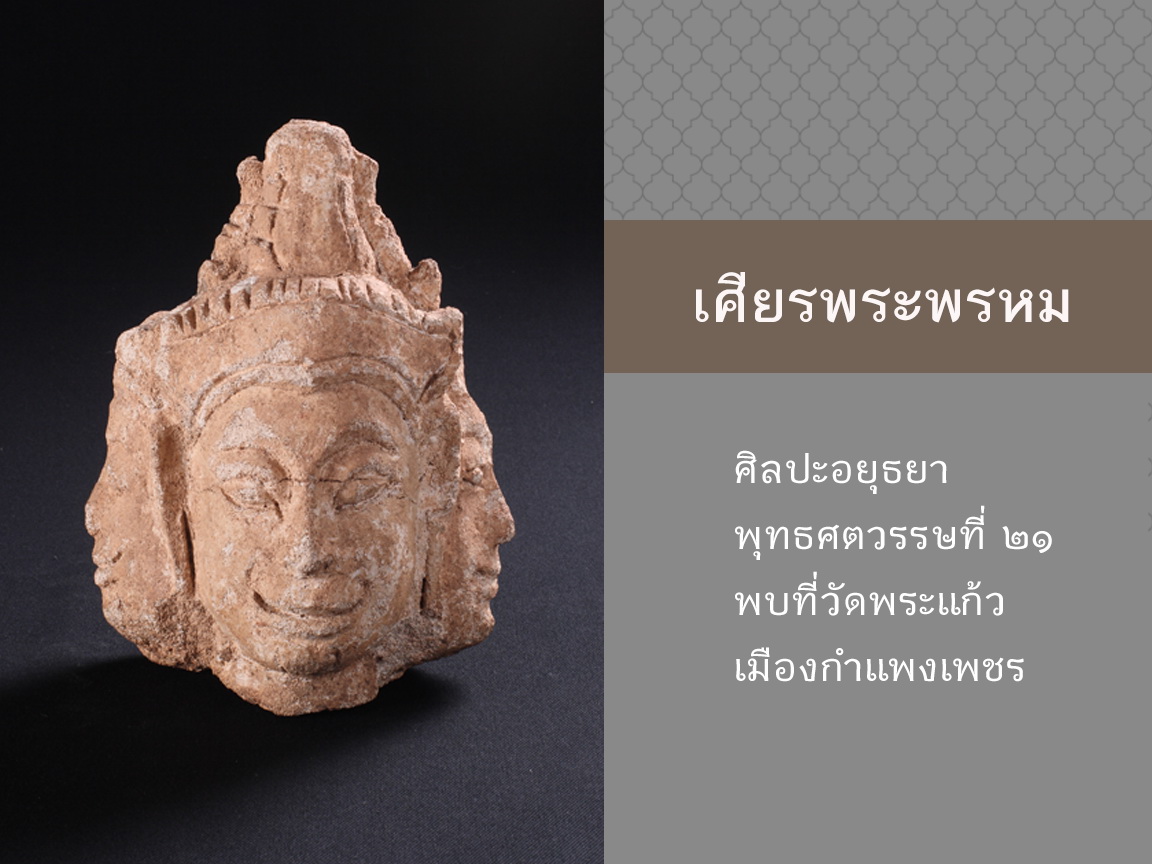 เศียรพระพรหมปูนปั้นประดับศาสนสถาน ได้จากวัดพระแก้ว กลางเมืองกำแพงเพชร ลักษณะพระพักตร์ค่อนข้างยาว แสดงให้เห็นเพียงสามพักตร์ สวมกระบังหน้า พระขนงโกงต่อกันเหนือสันพระนาสิก พระเนตรเบิกโต พระโอษฐ์บางอมยิ้มเล็กน้อย