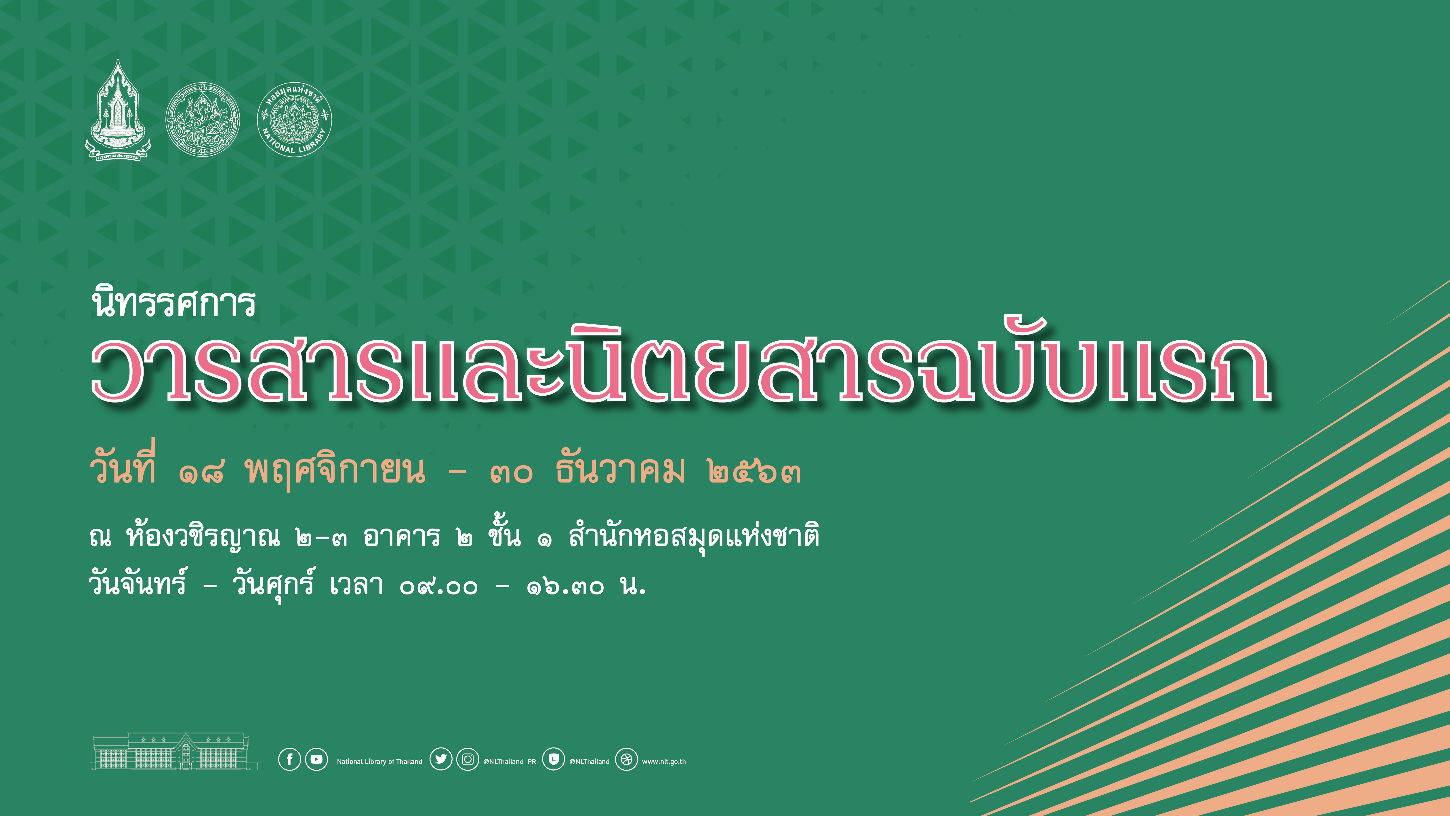 กรมศิลปากร โดยสำนักหอสมุดแห่งชาติ ขอเชิญชม “นิทรรศการวารสาร และนิตยสารฉบับแรก” ระหว่างวันที่ ๑๘ พฤศจิกายน - ๓๐ ธันวาคม ๒๕๖๓ ณ ห้องวชิรญาณ ๒ - ๓ ชั้น ๑ อาคาร ๒ สำนักหอสมุดแห่งชาติ ถนนสามเสน แขวงวชิรพยาบาล เขตดุสิต กรุงเทพฯ