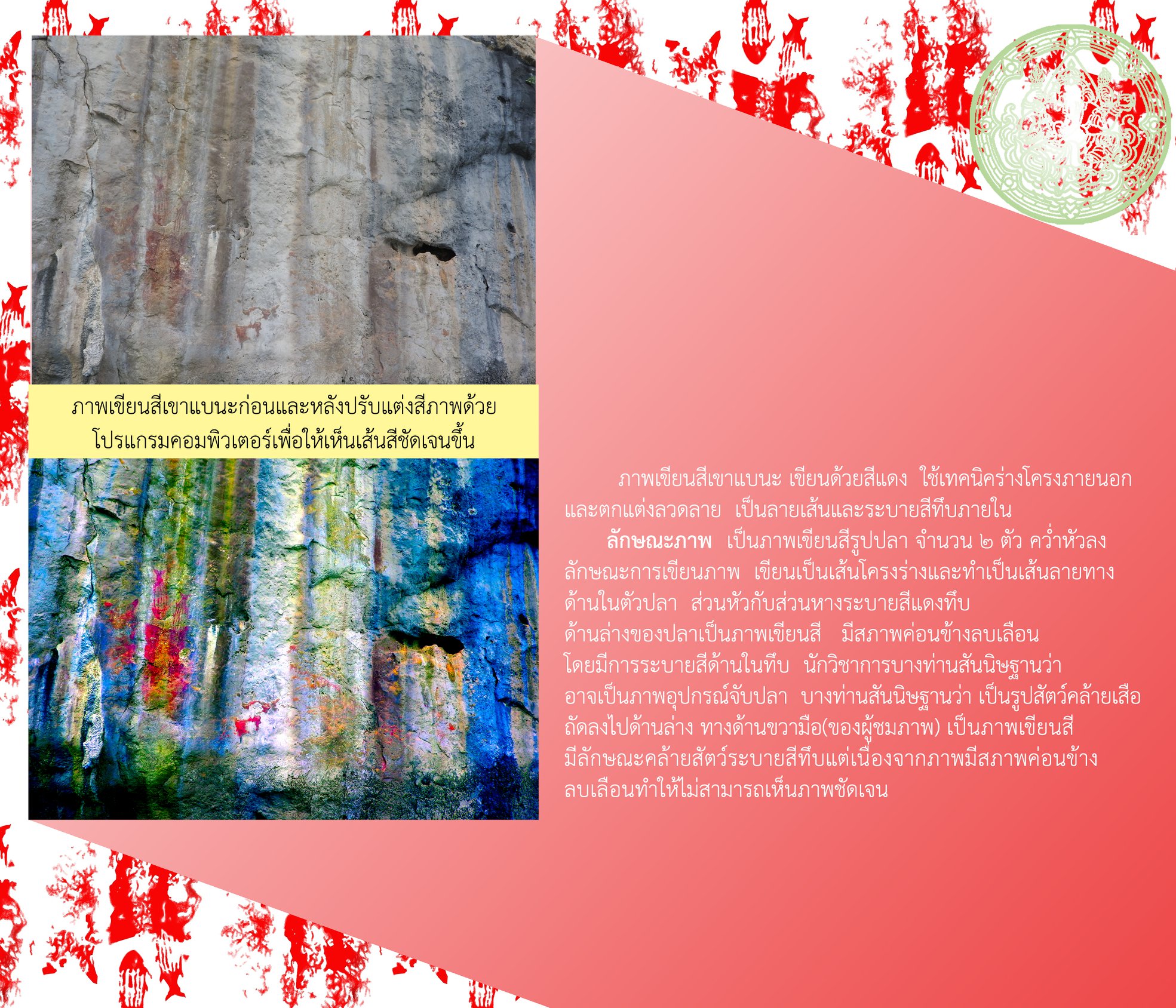 ลักษณะภาพ เป็นภาพเขียนสีรูปปลา จำนวน ๒ ตัว คว่ำหัวลง ลักษณะการเขียนภาพเขียนเป็นเส้นโครงร่าง และทำเป็นเส้นลายทางด้านในตัวปลา ส่วนหัวกับส่วนหางระบายสีแดงทึบ ด้านล่างของปลาเป็นภาพเขียนสี มีสภาพค่อนข้างลบเลือน โดยมีการระบายสีด้านในทึบ นักวิชาการบางท่านสันนิษฐานว่าอาจเป็นอุปกรณ์จับปลา บางท่านสันนิษฐานว่าเป็นรูปสัตว์คล้ายเสือ ถัดลงไปด้านล่างทางด้านขวามือ (ของผู้ชมภาพ) เป็นภาพเขียนสีมีลักษณะคล้ายสัตว์ระบายสีทึบแต่เนื่องจากภาพมีสภาพค่อนข้างลบเลือนทำให้ไม่สามารถเห็นภาพชัดเจน
