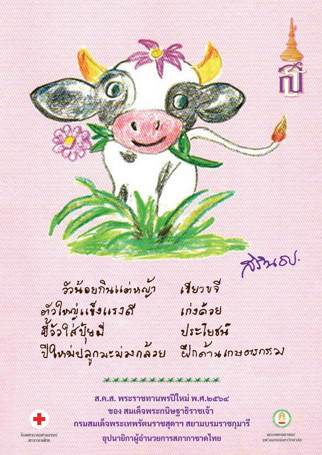 กรมสมเด็จพระเทพ พระราชทาน ส.ค.ส.ภาพฝีพระหัตถ์ วัวยิ้มสดใส และพรปีใหม่ ๒๕๖๔