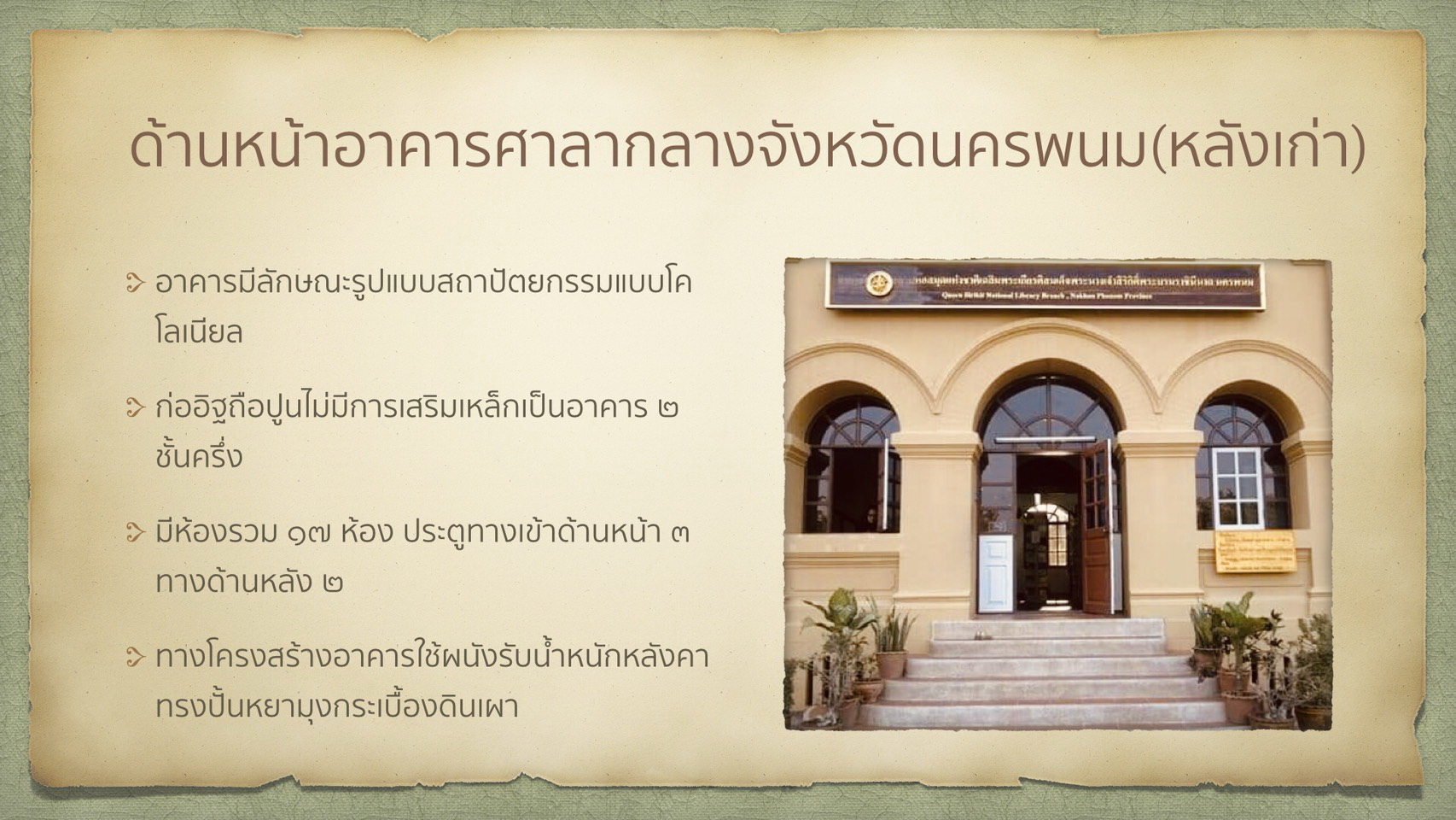 นครพนม เป็นจังหวัดชายแดนของประเทศไทยในภาคอีสานซึ่งมีพื้นที่ติดกับ สปป.ลาว โดยมีแม่น้ำโขงเป็นแนวกั้นแบ่งพรมแดน มีความยาวเลียบชายฝั่งแม่น้ำโขงประมาณ ๑๕๓ กิโลเมตร ตลอดความยาวเลียบชายฝั่งแม่น้ำโขงดังกล่าว จะพบอาคารเก่าสมัยอาณานิคมอยู่เป็นจำนวนมาก โดยเฉพาะอย่างยิ่งในเขตตัวเมืองนครพนม ซึ่งปัจจุบันจังหวัดนครพนมและภาคส่วนที่เกี่ยวข้องได้ร่วมกันอนุรักษ์ไว้ จนกลายมาเป็นแหล่งเรียนรู้และแหล่งท่องเที่ยวทางวัฒนธรรมที่สำคัญของจังหวัดนคร ที่ใครๆหลายคนให้ความสนใจมาศึกษาเที่ยวชม ในที่นี้จะขอเสนอเรื่องราวอาคารเก่าริมฝั่งโขงเมืองนครพนม โดยเริ่มจาก “อาคารศาลากลางจังหวัดนครพนม” หลังเก่า ซึ่งมีความโดดเด่นทางด้านสถาปัตยกรรมที่หลายคนได้มาเยี่ยมชมจะเกิดความประทับใจยิ่ง นอกจากความงามของอาคารภายนอกแล้ว การได้เข้าไปในตัวอาคารเพื่อนั่งอ่านหนังสือเล่มโปรดในบรรยายกาศที่เงียบสงบ ยิ่งเพิ่มความประทับได้ในอีกรูปแบบหนึ่งด้วย เนื่องจากปัจจุบัน อาคารศาลากลางจังหวัดนครพนมหลังเก่า กรมศิลปากรได้ดำเนินการอนุรักษ์และใช้ประโยชน์เป็น “หอสมุดแห่งชาติเฉลิมพระเกียรติ สมเด็จพระนางเจ้าสิริกิติ์ พระบรมราชินีนาถ นครพนม” ตั้งแต่ พ.ศ. ๒๕๓๗ เป็นต้นมา
