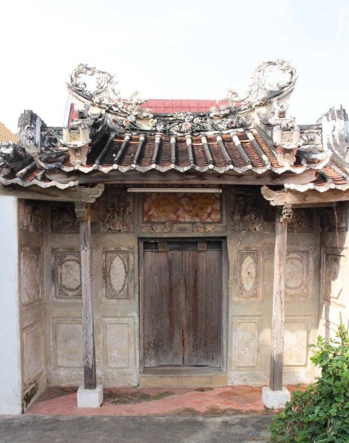 ซุ้มประตูจีน มีลักษณะตัวซุ้มประตูก่ออิฐถือปูน ประตูทางเข้าและเครื่องบนทำจากไม้ หลังคา มุงกระเบื้องดินเผาสีแดง สันหลังคาประดับลวดลายกระเบื้องเคลือบ ในการศึกษานี้แบ่งศึกษาเป็นส่วนต่าง ๆ ดังนี้