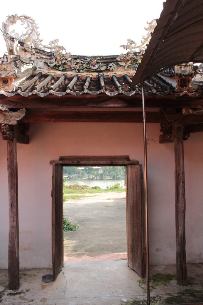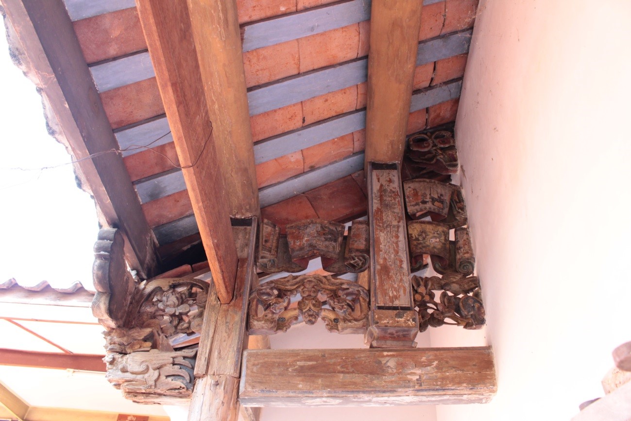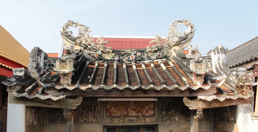 ส่วนหลังคา หลังคาแบบซานเหมินติ่ง หมายถึง หลังคาสำหรับซานเหมิน ซานเหมิน คือชื่อเรียกอาคารหรือซุ้มด้านหน้าของบริเวณหนึ่ง โดยปกติอาคารซานเหมินจะทำหลังคาลดหนึ่งชั้นหรือซ้อนชั้น สันหลังคามีลักษณะแอ่นตรงกลาง ปลายสันหลังคาทั้ง ๒ ด้านจะเชิดหัวขึ้น ส่วนปลายสุดทำเป็นรูปหางนกนางแอ่น บนหางนกนางแอ่นเป็นมังกรพ่นน้ำลายเครือเถาหรือใบไม้ม้วนสะบัดปลายทั้งสองด้าน ส่วนกลางของสันหลังคาประดับปูนปั้นรูปกิเลน และหงส์ชูดอกโบตั๋นและดอกเบญจมาศตกแต่งด้วยกระเบื้องเคลือบสีต่างๆ หลังคามุงด้วยกระเบื้องรางสีแดงที่มีลักษณะเป็นแผ่นแบนโค้งหงาย ตอนบน คือ ส่วนตั้งแต่เหนือขอบประตูจรดใต้หลังคา ส่วนนี้ประกอบด้วย ป้ายชื่อบ้าน และภาพเล่าเรื่อง ฮก ลก ซิ่ว