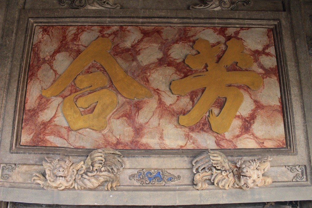 ป้ายชื่อบ้านเป็นตัวอักษรจีน 2 ตัว 合芳 สีเหลืองบนพื้นสีแดง อ่านว่า “ฮวง ฮะ” (แต้จิ๋ว, อ่านจากหลังมาหน้า) เป็นชื่อเจ้าของบ้าน สอดคล้องกับหลักฐานการสร้างศาลเจ้าพ่อกวนอูว่า สมเด็จเจ้าพระยาศรีสุริยวงศ์แบ่งพื้นที่ส่วนหนึ่งของวัดศรีสุริยวงศ์ จำนวน ๒ ไร่ ๓๗ ตารางวา ให้แก่ชาวราชบุรีสร้างศาลเจ้าโดยการนำของนายฮวงฮะ แซ่อึ้ง นายเซียมง้วน แซ่เตียว ร่วมกันสละทรัพย์สินตามจิตศรัทธา หรืออ่านว่า “ฟาง เหอ” (จีนกลาง) แปลว่า กลิ่นหอม บรรยากาศดี