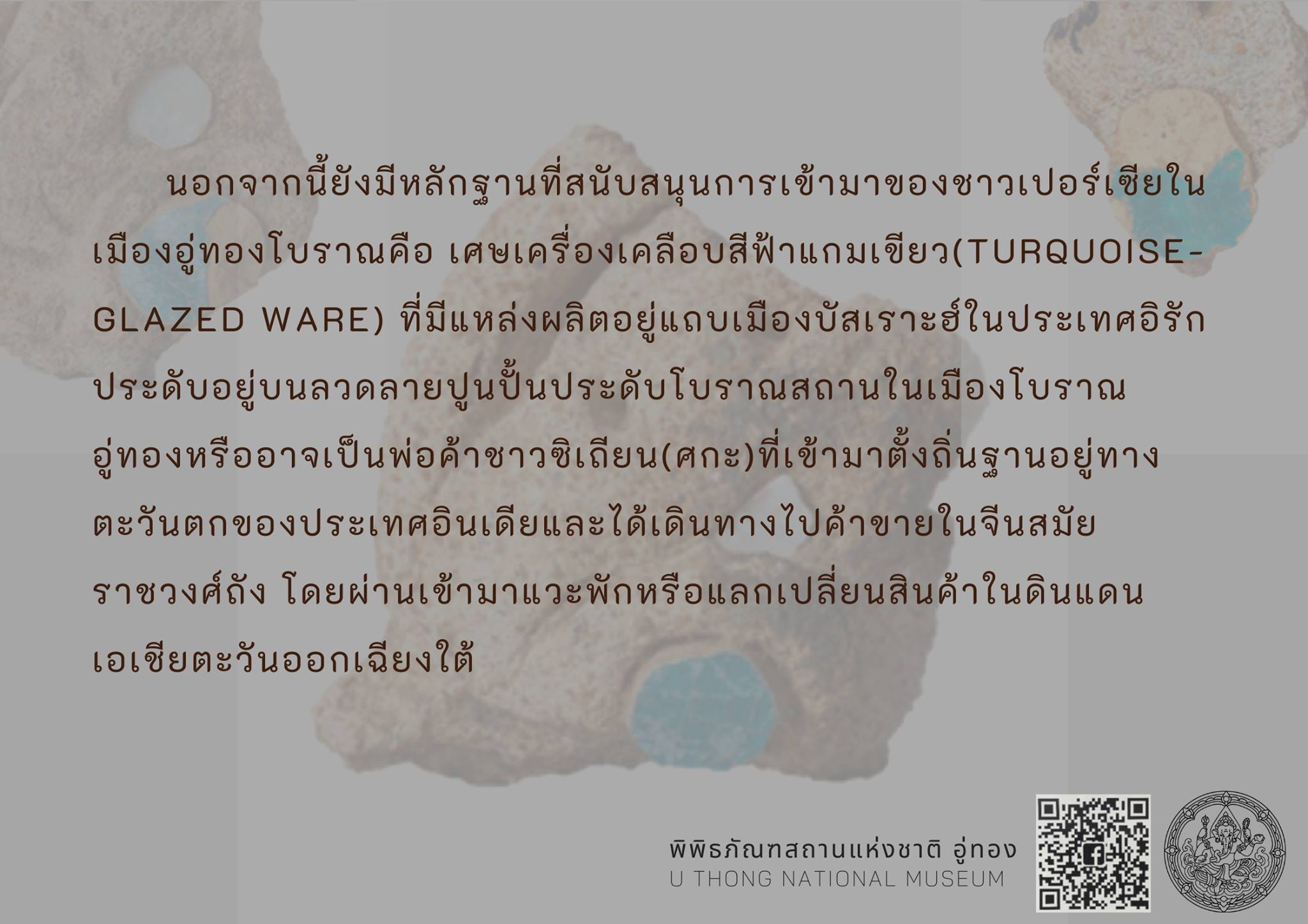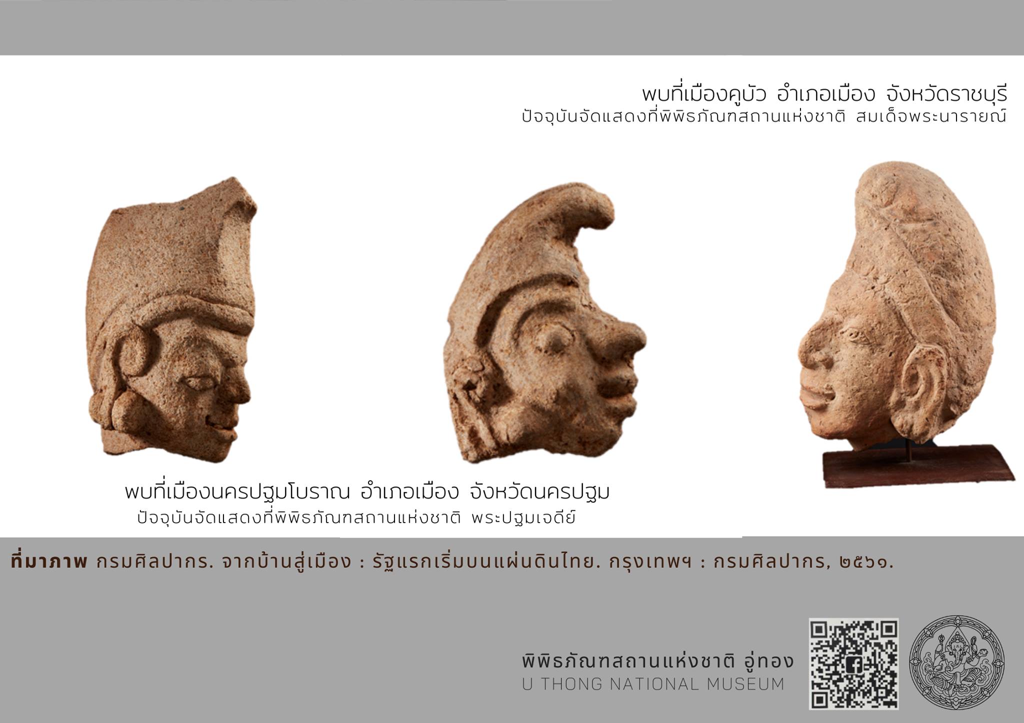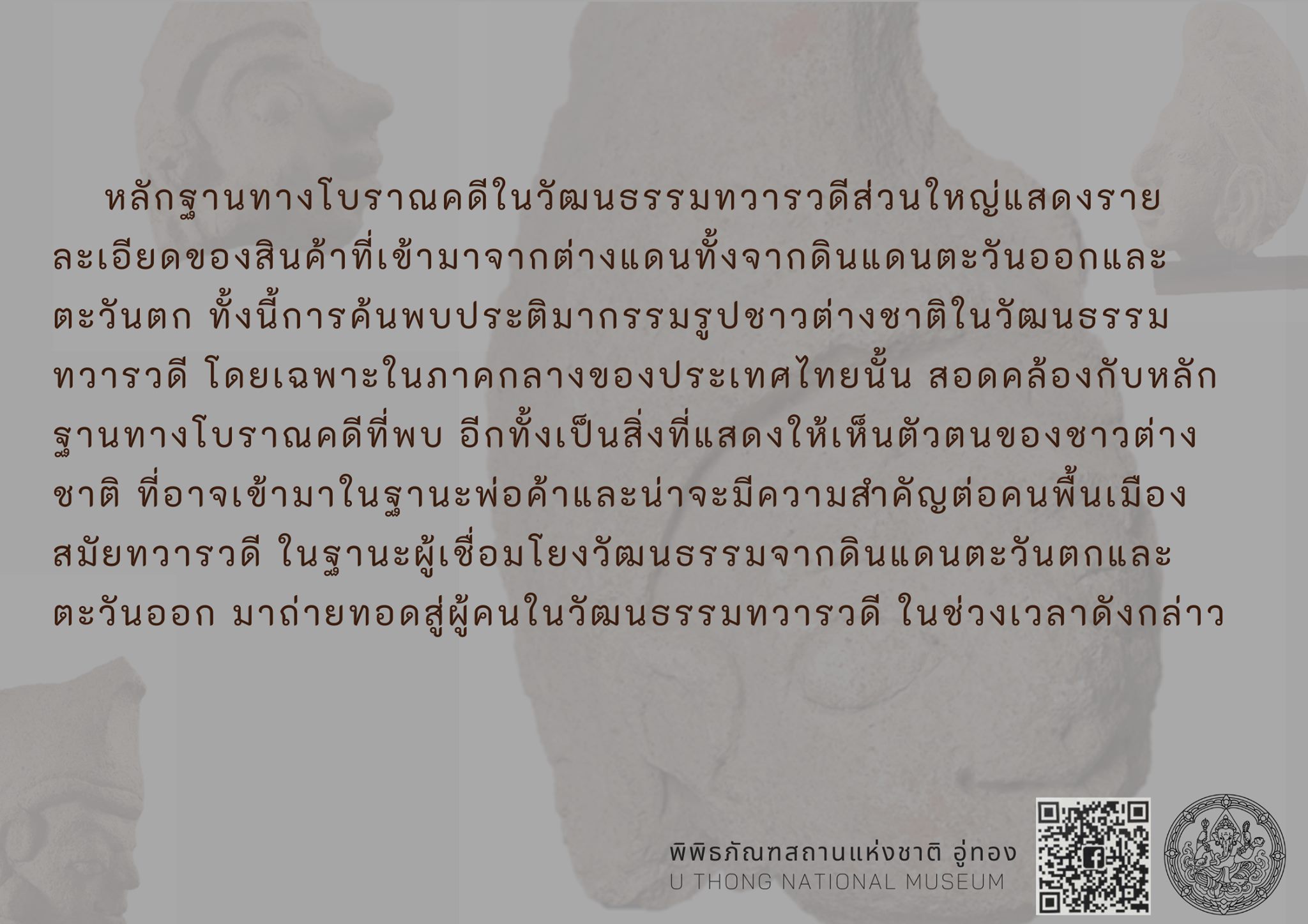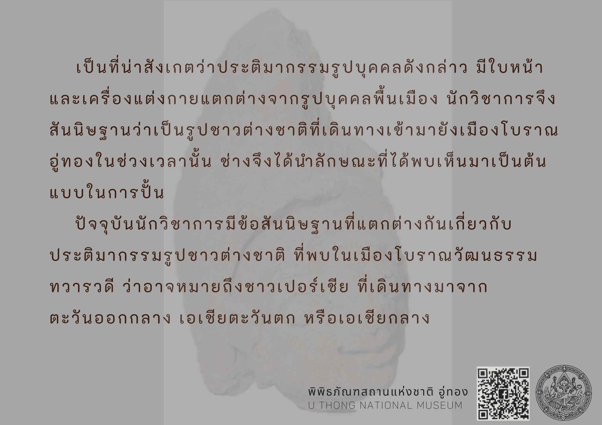 ประติมากรรมปูนปั้นศีรษะชาวต่างชาติ พบที่โบราณสถานหมายเลข ๕ เมืองโบราณอู่ทอง อำเภออู่ทอง จังหวัดสุพรรณบุรี จัดแสดง ณ ห้องอู่ทองศรีทวารวดี พิพิธภัณฑสถานแห่งชาติ อู่ทอง