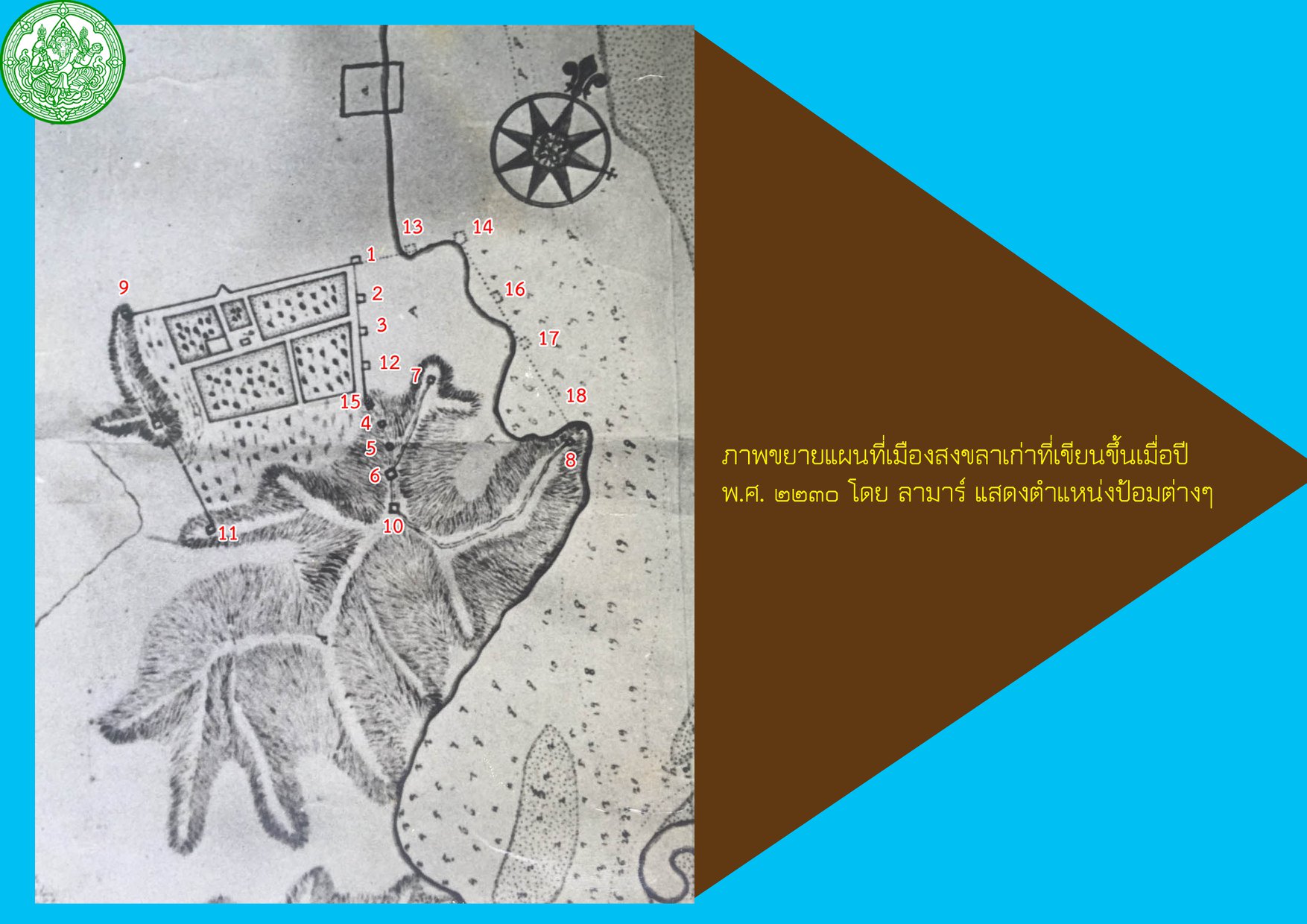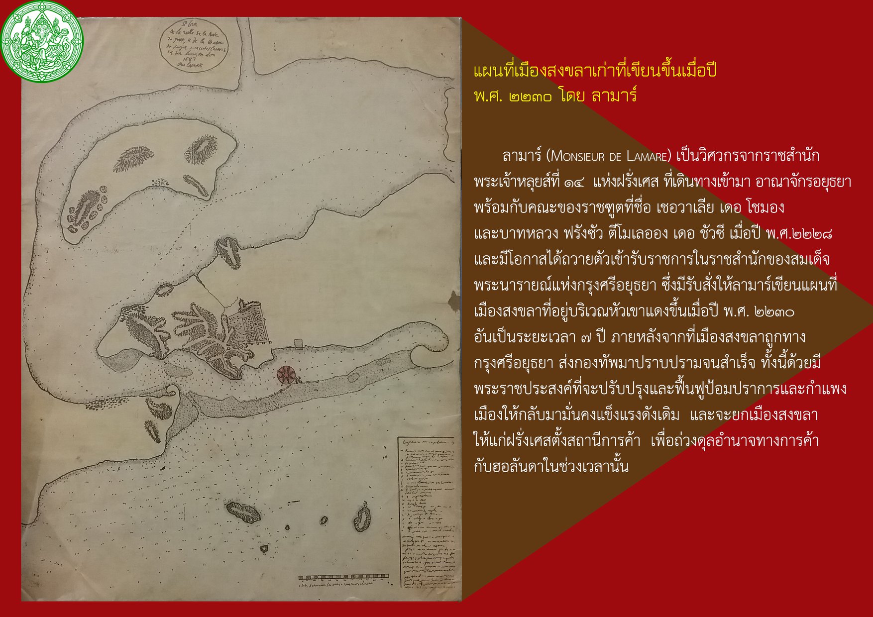 ทั้งนี้ เมืองสงขลาเก่าสมัยกรุงศรีอยุธยานั้นเป็นเมืองที่มีคูเมือง กำแพงเมือง และป้อมปราการ เป็นอาณาเขตและเป็นปราการของเมือง แผนผังเมืองที่เขียนขึ้นเมื่อปี พ.ศ. ๒๒๓๐ โดยวิศวกรชาวฝรั่งเศสที่ชื่อ เดอ ลามาร์ (Monsieur de Lamare) แสดงแผนผังเมืองเป็นรูปสี่เหลี่ยม มีคูเมืองและกำแพงเมืองเป็นปราการด้านทิศเหนือ ทิศตะวันออก และทิศตะวันตก มีเขาแดงและเขาค่ายม่วงเป็นปราการด้านทิศใต้