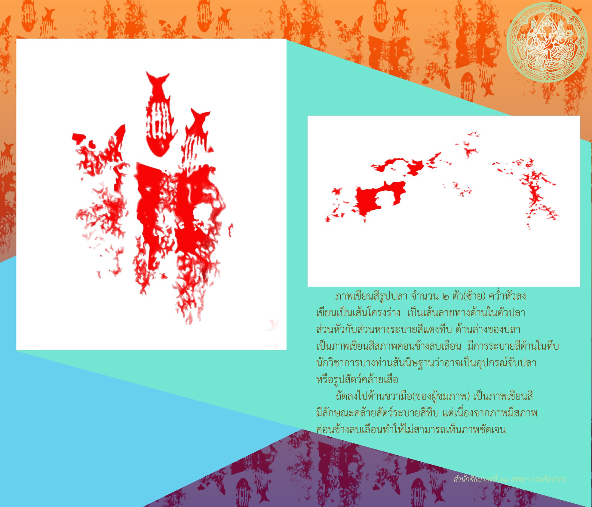 เป็นภาพเขียนสีรูปปลา จำนวน ๒ ตัว คว่ำหัวลง ลักษณะการเขียนภาพเขียนเป็นเส้นโครงร่าง และทำเป็นเส้นลายทางด้านในตัวปลา ส่วนหัวกับส่วนหางระบายสีแดงทึบ ด้านล่างของปลาเป็นภาพเขียนสี มีสภาพค่อนข้างลบเลือน โดยมีการระบายสีด้านในทึบ นักวิชาการบางท่านสันนิษฐานว่าอาจเป็นอุปกรณ์จับปลา บางท่านสันนิษฐานว่าเป็นรูปสัตว์คล้ายเสือ ถัดลงไปด้านล่างทางด้านขวามือ (ของผู้ชมภาพ) เป็นภาพเขียนสีมีลักษณะคล้ายสัตว์ระบายสีทึบแต่เนื่องจากภาพมีสภาพค่อนข้างลบเลือนทำให้ไม่สามารถเห็นภาพชัดเจน
