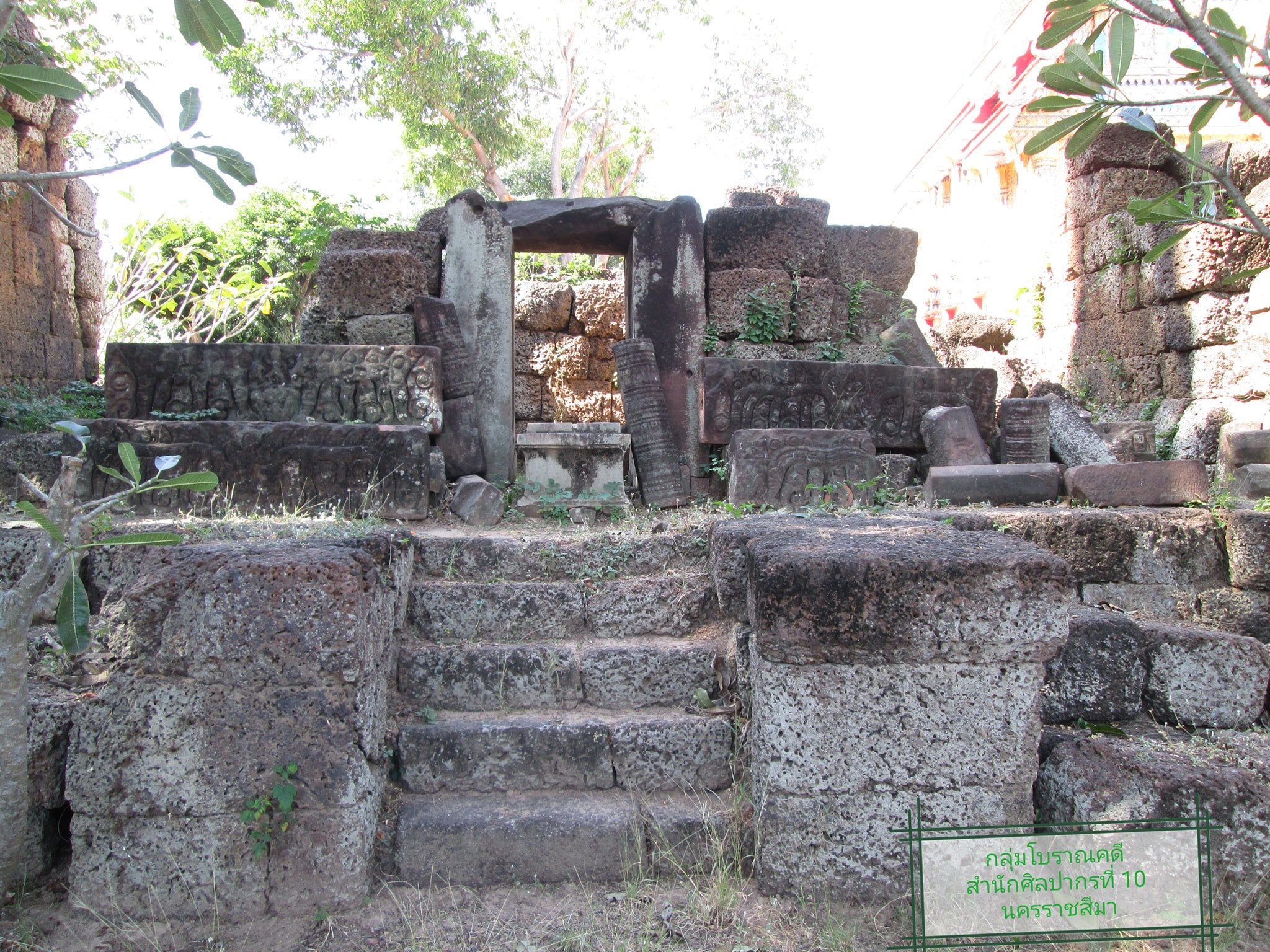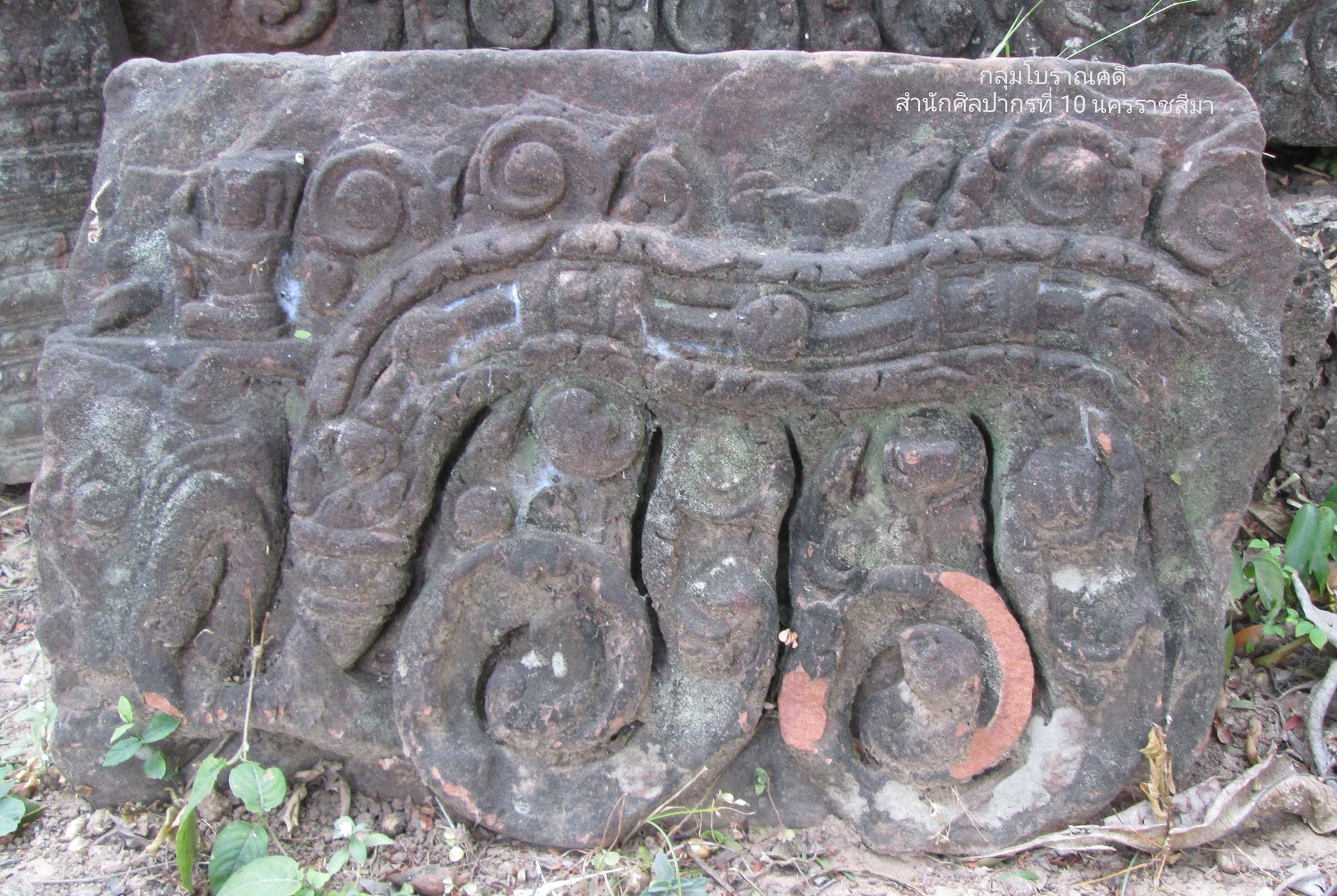 #ทับหลังชิ้นที่3 ทับหลังชิ้นนี้ ยังไม่สามารถศึกษาได้ชัดเจนว่าเป็นภาพสลักของเทพองค์ใดหรือเรื่องราวอะไร บริเวณกลางแผ่นทับหลังสลักลวดลายเป็นรูปบุคคลสองคนยืนคู่กันภายในซุ้มเรือนแก้วเหนือสัตว์พาหนะคล้ายโค บุคคลสองคนยืนคู่กัน อยู่ในท่ายืนเอาข้างลำตัวชิดกัน มือประคองกอดเอวกันไว้ ทั้งสองคนยกแขนชูมือที่เหลืออีกข้างหนึ่งขึ้น คนที่อยู่ด้านขวามือยกแขนขวา คนที่อยู่ด้านซ้ายมือยกแขนซ้าย ด้านข้างของสัตว์พาหนะมีสัตว์คล้ายสิงห์ยืนอยู่ สัตว์คล้ายสิงห์อยู่ในท่ายืนหันหน้าออกด้านข้าง ตัวหนึ่ง หันออกไปทางด้านซ้าย ตัวหนึ่งหันออกไปทางด้านขวา ทั้งสองตัวยกขาหน้าชูประคองท่อนพวงมาลัยเอาไว้ ท่อนพวงมาลัยวกขึ้นด้านบนและโค้งลงที่ปลายทับหลังทั้งสองข้าง เหนือท่อนพวงมาลัยมีลายใบไม้ รูปสามเหลี่ยมตั้งขึ้นด้านบน ส่วนด้านล่างเป็นลายใบไม้ม้วนห้อยตกลงมา เป็นรูปแบบของศิลปะเขมรแบบ บาปวน (พ.ศ.1560 – พ.ศ.1630) ภาพสลักของทับหลังชิ้นนี้ สันนิษฐานเบื้องต้นได้ว่า อาจเป็นพระกฤษณะยืนคู่กับพระพลราม หรืออาจเป็นพระกฤษณะต่อสู้กับกับนักมวยปล้ำชื่อจาณูระ ในเรื่องมหาภารตะ