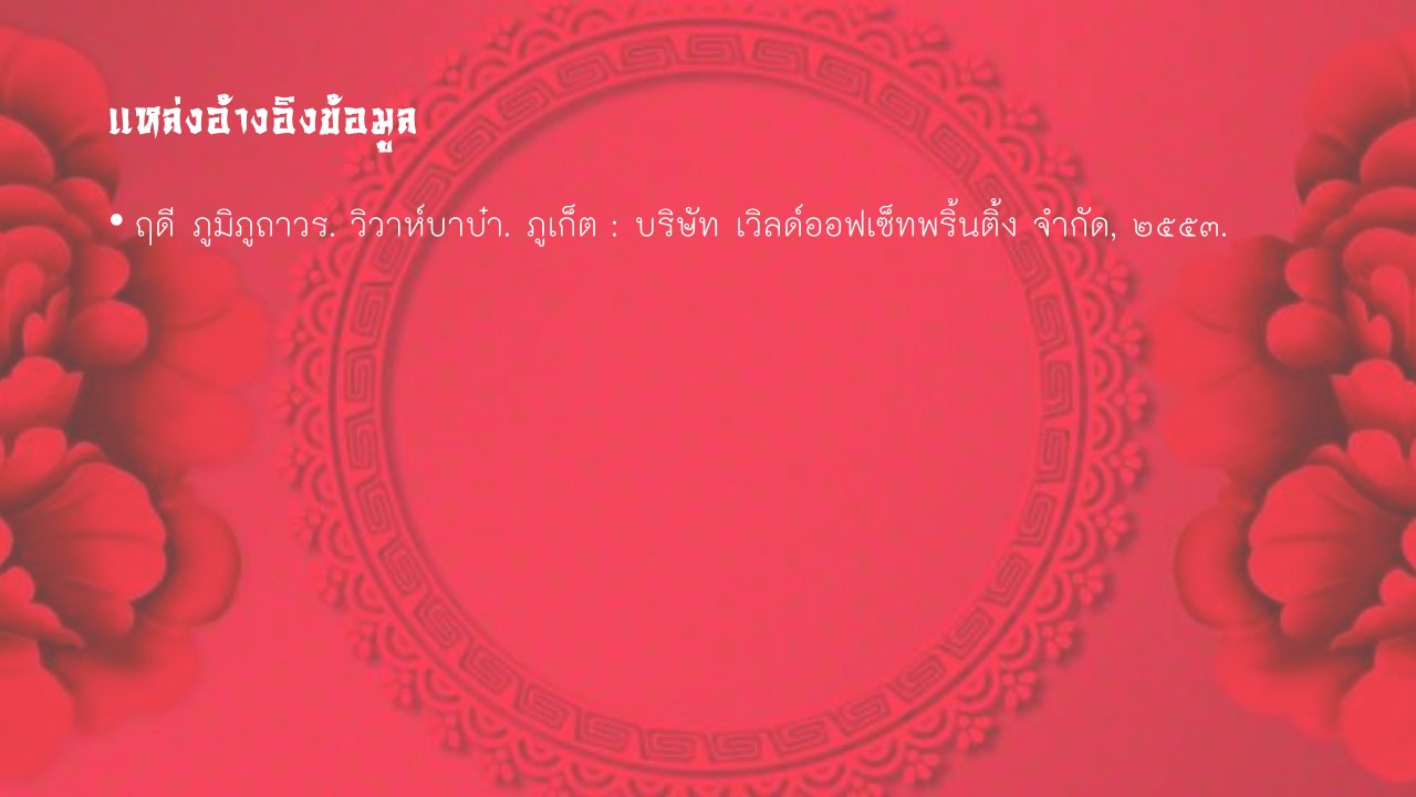 - ฤดี ภูมิภูถาวร. วิวาห์บาบ๋า. ภูเก็ต : บริษัท เวิลด์ออฟเซ็ทพริ้นติ้ง จำกัด, ๒๕๕๓.