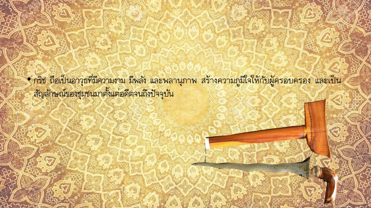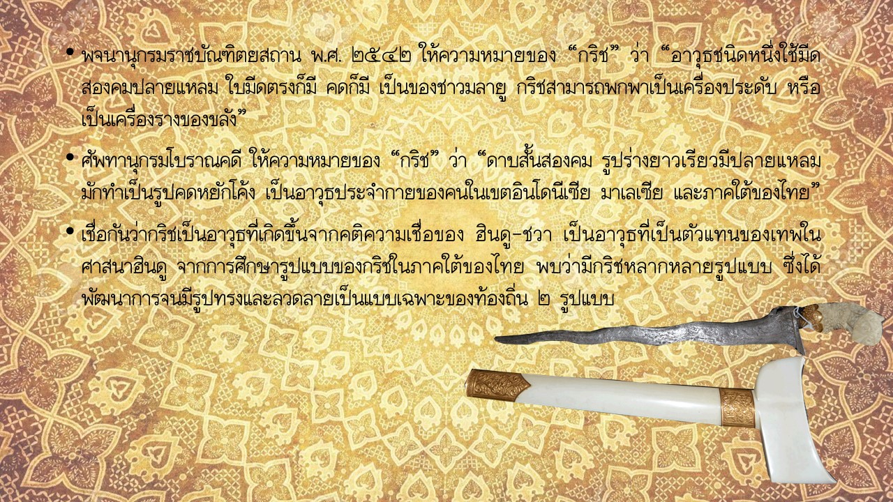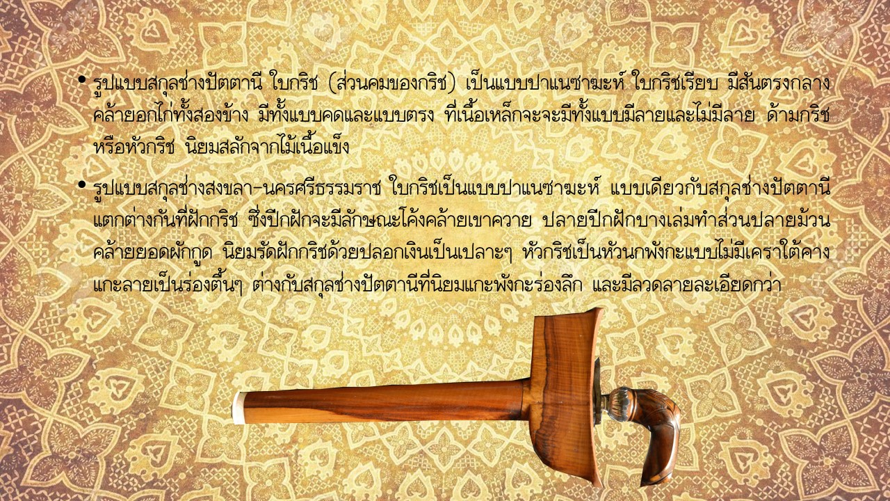 ๒. รูปแบบสกุลช่างสงขลา-นครศรีธรรมราช กริชสกุลช่างสงขลา-นครศรีธรรมราช ในส่วนของใบกริชหรือตากริชเป็นแบบ “ปาแนซาฆะห์” เหมือนสกุลช่างปัตตานี แต่มีลักษณะที่ต่างกันตรงฝักกริชที่ปีกฝักมีความโค้งดูคล้ายเขาควาย ปลายปีกฝักบางเล่มจะทาให้ม้วนปลายคล้ายเลยหนึ่งแบบเลขไทยหรือยอดผักกูด นิยมรัดฝักกริชด้วยปลอกเงินเป็นเปลาะๆ ส่วนหัวกริชเป็นหัวนกพังกะแบบไม่มีเคราใต้คาง แกะลายเป็นร่องตื้นๆ ผิดกับฟังกะแบบสกุลช่างปัตตานีที่นิยมแกะร่องลึก และมีลวดลายที่ละเอียดมากกว่า “กริช” ที่ยังคงความงามมีพลังและพลานุภาพ ที่มีคุณค่าสร้างความภูมิใจให้กับผู้ครอบครองเป็นสัญลักษณ์ของชุมชนมาตั้งแต่อดีตจนถึงปัจจุบัน
