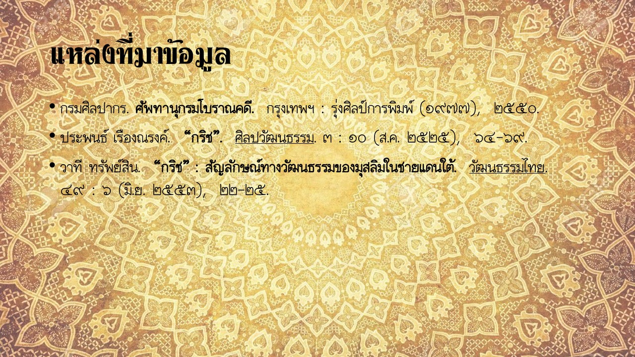 -ประพนธ์ เรืองณรงค์. “กริช”.ศิลปวัฒนธรรม. ปีที่ 3, ฉบับที่ 10 (ส.ค. 2525) : หน้า 64-69 -วาที ทรัพย์สิน.“กริช : สัญลักษณ์ทางวัฒนธรรมของมุสลิมในชายแดนใต้”วัฒนธรรมไทย. ปีที่ 49, ฉบับที่ 6 (มิ.ย. 2553) : หน้า 22-25
